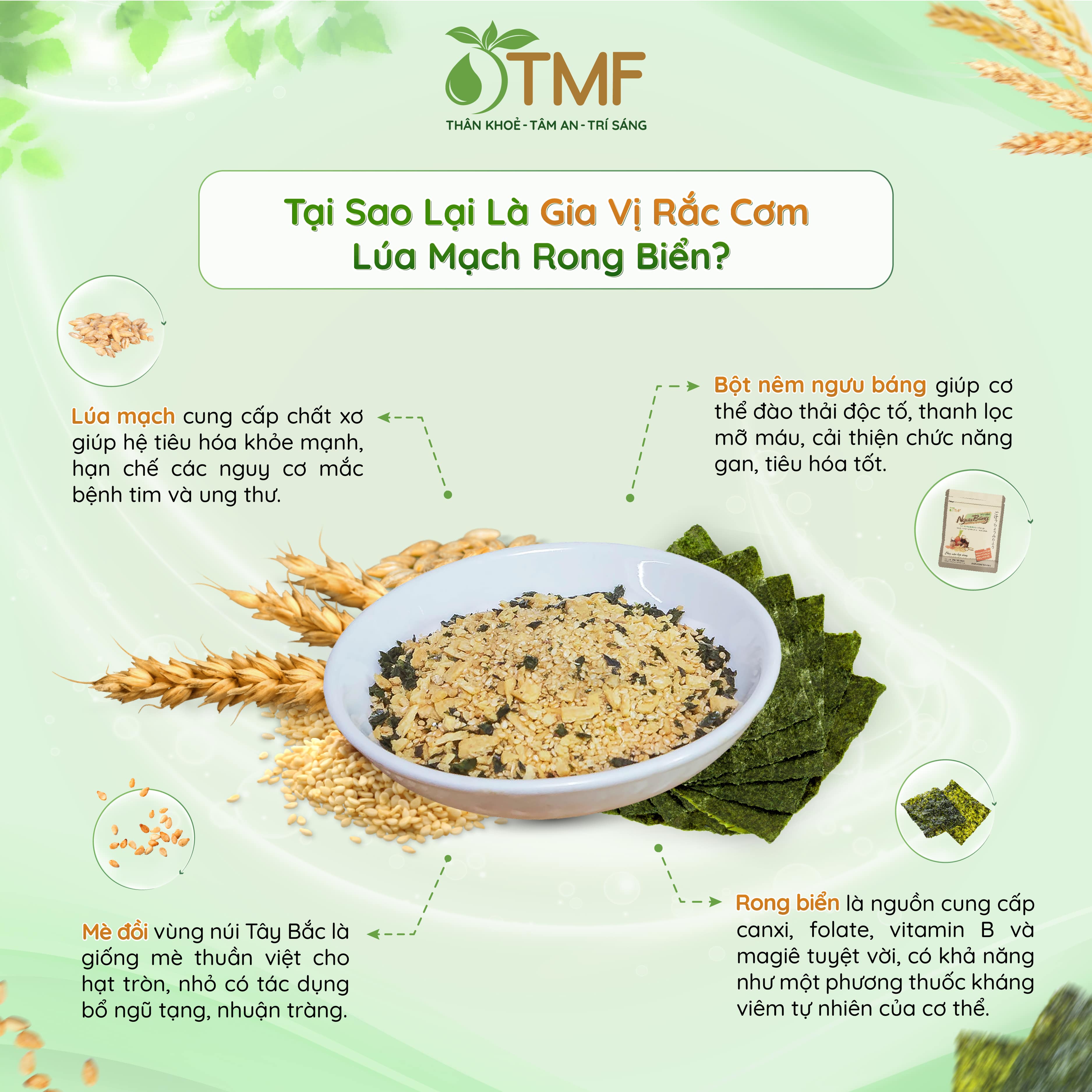 Sản phẩm có nguồn gốc hoàn toàn tự nhiên, không hóa chất, từ các nguyên liệu cao cấp được chọn lọc kỹ lưỡng. Lúa mạch chứa nhiều chất xơ không tan, giàu protein và vitamin giúp giảm cholesterol trong máu, rất tốt cho quá trình giảm cân, ngăn ngừa các bệnh về tim và đường ruột. Rong biển với công dụng chống ung thư nhờ hợp chất thực vật Lignans có khả năng ức chế hình thành các khối u. Bên cạnh đó, gia vị rắc cơm lúa mạch rong biển cung cấp chất béo thực vật từ mè đồi và sử dụng bột nêm ngưu báng không có chất bảo quản, an toàn cho sức khỏe người dùng.