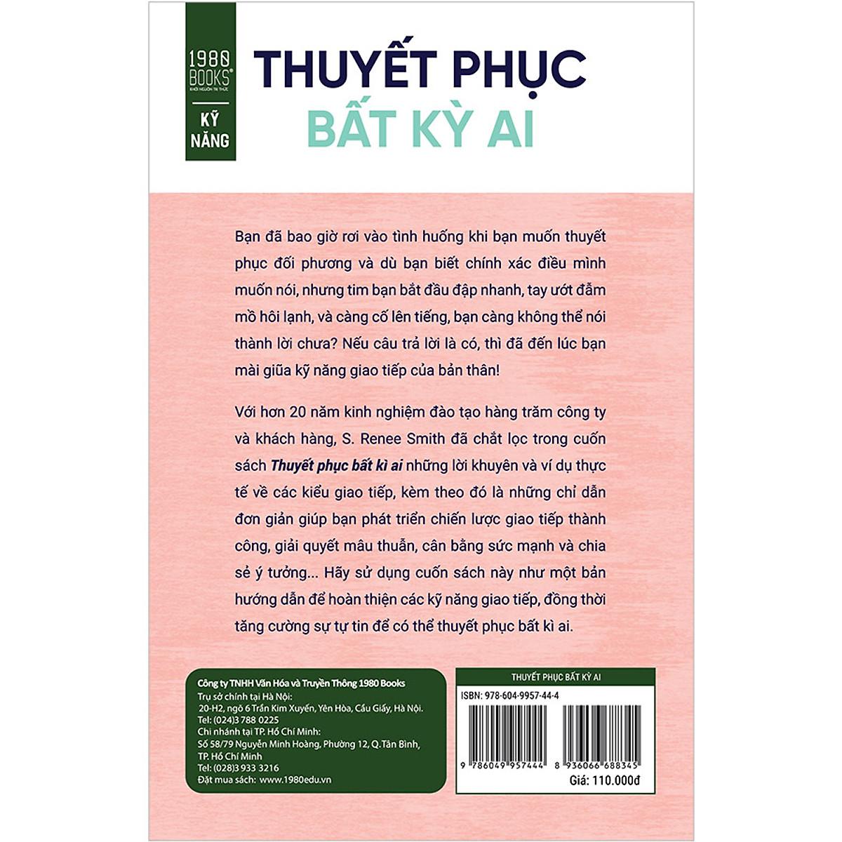 Mua tại TiktokBạn đã bao giờ rơi vào tình huống khi bạn muốn thuyết phục đối phương và bạn biết chính xác điều mình muốn nói, nhưng bỗng dưng tim bạn bắt đầu đập nhanh, tay đẫm mồ hôi lạnh, và càng cố lên tiếng, bạn càng không thể nói thành lời chưa? Nếu câu trả lời là có, thì đã đến lúc bạn mài giũa khả năng giao tiếp của bản thân! Với hơn 20 năm kinh nghiệm đào tạo hàng trăm công ty và khách hàng, S. Renee Smith sẽ hỗ trợ bạn trên cuộc hành trình này. Mục tiêu cả cuộc đời của S. Renee Smith là tìm kiếm sức mạnh của chính mình và giúp đỡ người khác tìm kiếm và sống đúng với khả năng tiềm ẩn của họ. Cuốn sách này chính là kết quả từ chính mục tiêu đó. Thông qua cuốn sách “Thuyết phục bất kì ai”, tác giả sẽ giới thiệu nhiều lời khuyên và ví dụ thực tế về các kiểu giao tiếp dựa trên những chuyện người thực việc thực, kèm theo đó là tấm bản đồ chỉ dẫn đơn giản để giúp bạn phát triển chiến lược giao tiếp thành công giúp giải quyết mâu thuẫn, cân bằng sức mạnh, chia sẻ ý tưởng, hồi đáp những cử chỉ khó ưa, và ứng phó với khoảnh khắc lúng túng. Thông qua những kinh nghiệm thực tiễn của bản thân, tác giả đã chắt lọc những gì mình đã học được về giao tiếp quyết đoán thành 5 bước cơ bản, giúp bạn hiểu phong cách giao tiếp của mình và xác định những thay đổi bạn có thể thực hiện để trở thành một người giao tiếp quyết đoán và tự tin hơn: Bước 1 - Xác định điểm bắt đầu: Bao gồm những bài tập giúp bạn hiểu biết sâu sắc hơn về bản thân và kiểu giao tiếp của mình. Bước 2 - Lắng nghe quyết đoán: Các chiến lược duy trì sự tự chủ, bất kể đối phương nói hay làm gì, đồng thời học được cách thừa nhận quan điểm của người khác mà không có vẻ trịch thượng, cũng như đưa ra phản hồi mà không xúc phạm. Bước 3 - Giao tiếp không lời quyết đoán: Cách rèn luyện kỹ năng xây dựng mối quan hệ hiệu quả giữa người với người, từ đó tăng cường lợi ích kinh doanh, thay đổi sự nghiệp, và tái thiết mối quan hệ cá nhân. Bước 4 - Tự tin lên tiếng: Học cách kết hợp các kỹ năng giao tiếp quyết đoán với kỹ năng giao tiếp bằng lời để bạn giao tiếp tự tin, thành công và quả quyết hơn. Bước 5 -Phản hồi trực tiếp: Cách tiếp nhận những lời phản hồi với thái độ tích cực và tận dụng chúng để phát triển bản thân. Khi đọc cuốn sách này, bạn chắc chắn đang kiếm tìm điều gì đó cụ thể. Rất có thể bạn gặp rào cản tự ti cần phá bỏ, một khoảng cách giao tiếp mà bạn muốn lấp đầy, hoặc một khó khăn mà bạn đang lên kế hoạch giải quyết. Mục tiêu của S. Renee Smith là tạo ra trải nghiệm học hỏi vui vẻ và dễ dàng cho bạn, đồng thời đóng góp vào sự phát triển cá nhân và thành công nghề nghiệp của bạn. Nếu tuân thủ và ứng dụng các bước này khi giao tiếp, bạn sẽ phát triển được các kỹ năng cần thiết để giao tiếp hiệu quả và dứt khoát với mọi người. Bạn đã sẵn sàng trở thành một người giao tiếp quyết đoán chưa? Hãy cùng bắt đầu nào.