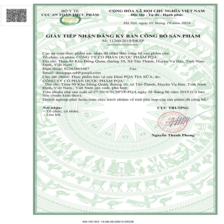 - Địa chỉ sản xuất: Công ty Cổ phần Dược phẩm PQA. Thửa 99, Khu Đồng Quàn, Xã Tân Thành, Huyện Vụ Bản, Tỉnh Nam Định. THÀNH PHẦN: