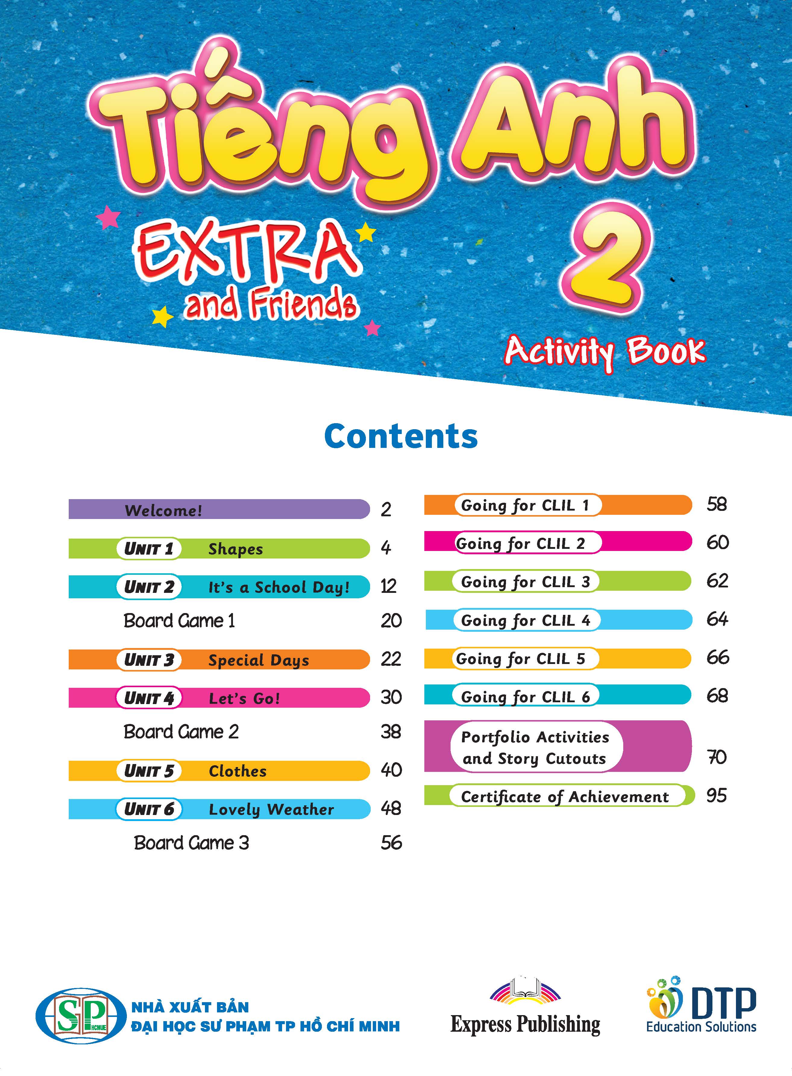 Mua tại TiktokBộ sách gồm: sách bài học, sách bài tập, vở tập viết. EXTRA and FRIENDS là một khóa học 5 cấp độ dành cho học sinh sơ cấp Tiếng Anh. Bộ sách theo chương trình giảng dạy Việt Nam và Khung Tham chiếu Chung Châu Âu về Ngôn ngữ (CEFR). Bộ sách nhằm mục đích phát triển các kỹ năng thiết yếu của thế kỷ 21 mà học sinh cần đối với thế giới hiện đại thông qua các hoạt động và nhiệm vụ khác nhau. Tiếng Anh 2 EXTRA and FRIENDS đã được Bộ Giáo dục và Đào tạo thẩm định và phê duyệt theo công văn 709 / QĐ-BGDĐT .