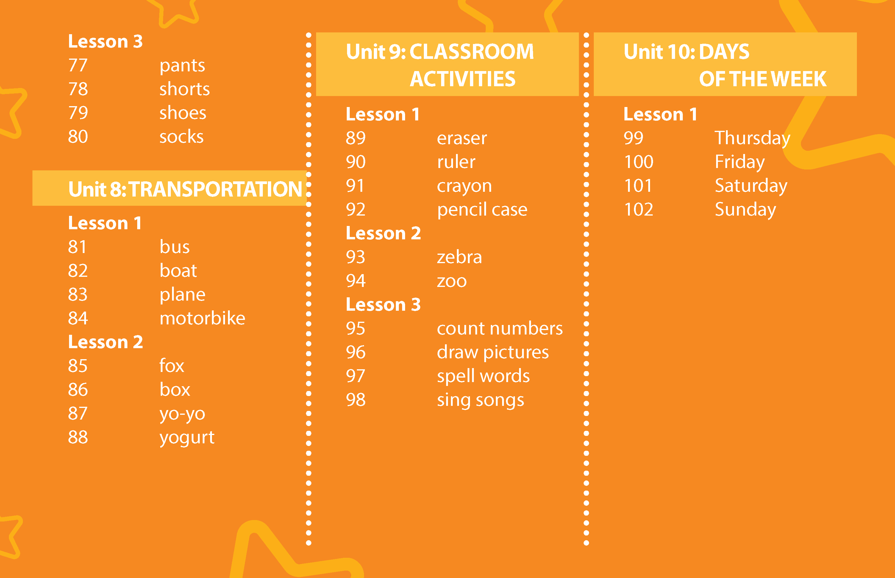 Sách: Learning English 4 - Dành Cho Học Sinh Lớp 4 NỘI DUNG VÀ CẤU TRÚC CỦA QUYỂN SÁCH : Bảng mục lục: Chỉ rõ các mục tiêu chính và trọng tâm của mỗi bài