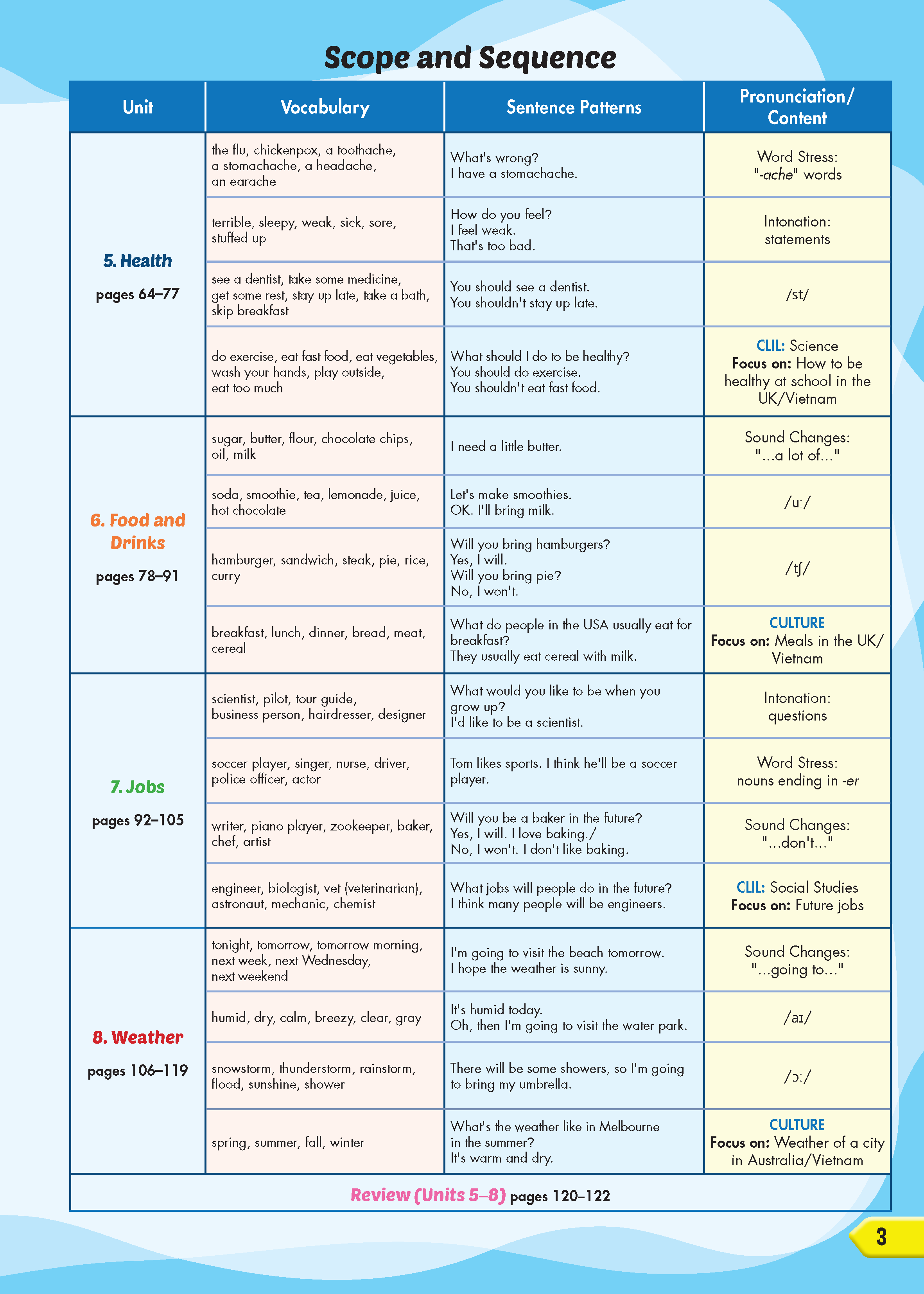 Sách: Learning English 5 - Dành Cho Học Sinh Lớp 5 NỘI DUNG VÀ CẤU TRÚC CỦA QUYỂN SÁCH : Bảng mục lục: Chỉ rõ các mục tiêu chính và trọng tâm của mỗi bài