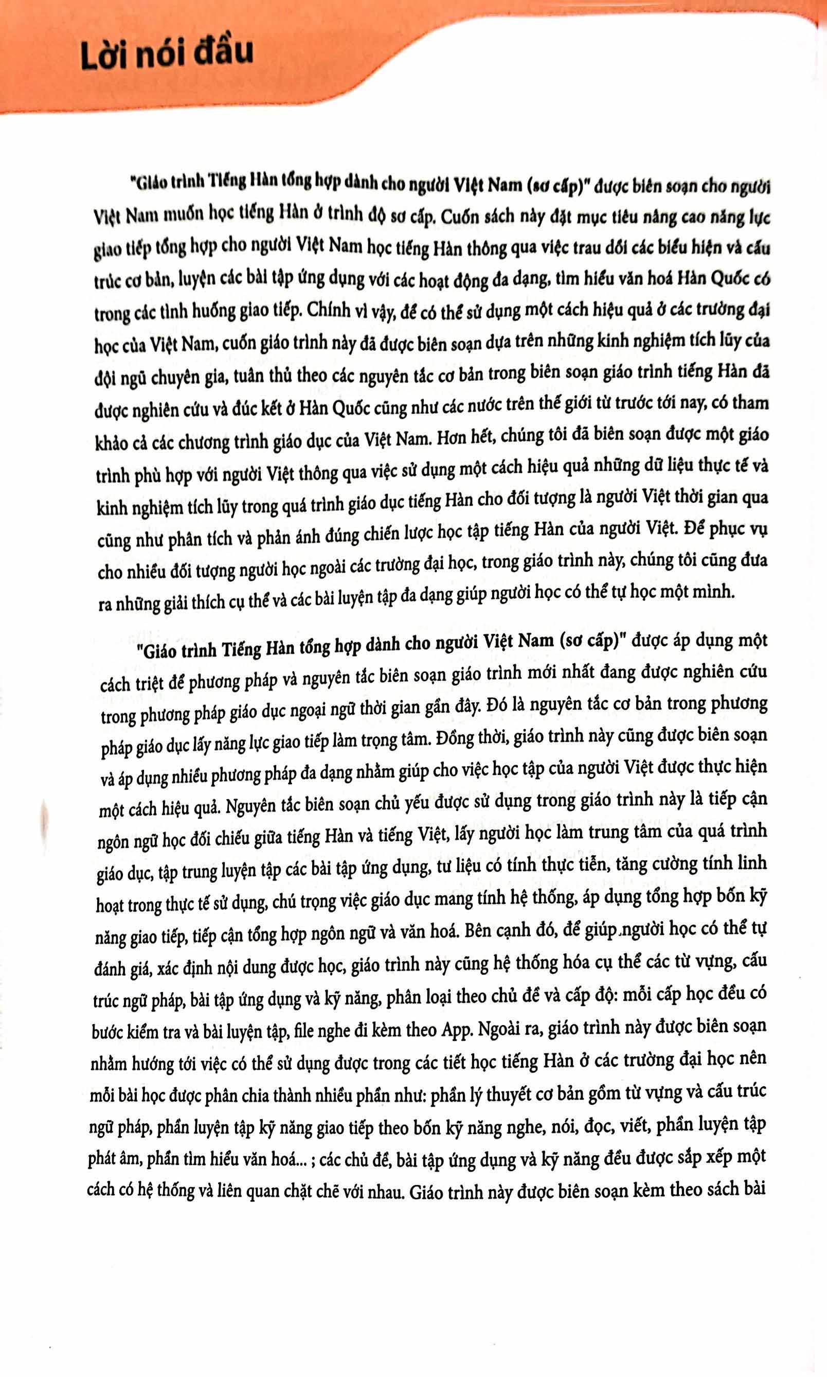 Tiếng Hàn Tổng Hợp Dành Cho Người Việt Nam - Sơ Cấp 1 Trong những năm gần đây, nhu cầu học tiếng Hàn và tìm hiểu về văn hóa Hàn Quốc đang có xu hướng tăng lên. Người học tiếng Hàn rất mong muốn có được một bộ giáo trình chuẩn, được biên soạn một cách tỉ mỉ và hữu ích nhất. Giáo trình tiếng Hàn tổng hợp lần đầu tiên được trao bản quyền chính thức tại Việt Nam Hiểu được điều đó, ngày 4-7, Đại diện chính phủ Hàn Quốc, ngài Woo Hyeong Min – Trưởng đại diện Văn phòng Quỹ giao lưu Quốc tế HQ tại Việt Nam cùng GS.TS.NGƯT Mai Ngọc Chừ – Chủ tịch Hội Nghiên cứu khoa học về Hàn Quốc của Việt Nam (KRAV) đã trao quyết định cho phép Công ty Cổ phần sách MCBooks của Việt Nam được xuất bản cuốn sách này tại thị trường Việt Nam. Và đây chính là bộ giáo trình tiếng Hàn tổng hợp đầu tiên có bản quyền chính thức có mặt tại Việt Nam. Cũng theo ông Woo Hyeong Min, Thực tế đây là bộ giáo trình chính thống mà tất cả người học tiếng Hàn tại Việt Nam cần sử dụng. Tuy nhiên nhiều năm qua bộ sách đến tay người dùng đều là sách lậu nên chưa đạt được kết quả mà chính phủ Hàn muốn mang tới Việt Nam. Do đó Chính phủ Hàn Quốc đã quyết định tìm 1 đơn vị xuất bản uy tín của Việt Nam để giúp họ mang đến cho người học những cuốn sách tiếng Hàn chất lượng tốt với giá cả hợp lý. Bộ giáo trình được Hội nghiên cứu khoa học Hàn Quốc của Việt Nam biên soạn và hiệu đính. Bộ giáo trình sẽ giúp nâng cao hiệu quả trong việc sử dụng ngôn ngữ Hàn sau tiếng mẹ đẻ và tiếng Anh, là nền tảng giúp người lao động Việt Nam nhận được những vị trí làm việc cao trong doanh nghiệp Hàn Quốc. Đây cũng là cách để thúc đẩy quan hệ hợp tác về văn hoá và giáo dục giữa hai nước trong thời gian tới. Giới thiệu cuốn Giáo trình tiếng Hàn tổng hợp dành cho người Việt Nam – Sơ cấp 1 Giáo trình tiếng Hàn tổng hợp dành cho người Việt Nam – Sơ cấp 1 được biên soạn dành cho người Việt Nam muốn học tiếng Hàn ở trình độ sơ cấp. Sách được biên soạn nhằm hướng tới việc sử dụng được trong các tiết học tiếng Hàn tại giảng đường đại học nên mỗi bài học được chia thành nhiều phần như: Lý thuyết cơ bản gồm từ vựng và cấu trúc ngữ pháp; phần luyện tập theo 4 kỹ năng giao tiếp như: Nghe – Nói – Đọc – Viết, phần luyện phát âm, phần tìm hiểu văn hóa… Các chủ đề trong sách được sắp xếp một cách có hệ thống và liên quan chặt chẽ với nhau. Giáo trình tiếng Hàn tổng hợp được biên soạn kèm theo một cuốn sách bài tập hỗ trợ giúp người học ôn tập kỹ hơn và có thể luyện tập nâng cao trong những trường hợp cần thiết. Nội dung trong Giáo trình tiếng Hàn tổng hợp – Sơ cấp 1 2 cuốn sách trong bộ Sơ cấp được xây dựng với 30 bài khóa và bảng chữ cái. Trong đó quyển 1 gồm phần bảng chữ cái và 15 bài đầu. Học hết quyển 1, bạn sẽ học đến quyển sơ cấp 2 với 15 bài còn lại. Cấu trúc tổng thể của giáo trình được xây dựng theo các chủ đề; mỗi chủ đề được liên kết thống nhất với một hệ thống các từ vựng và cấu trúc ngữ pháp cơ bản, bài tập ứng dụng, kỹ năng và tìm hiểu văn hóa. Trong mỗi bài học, nội dung học được chia thành các phần như: luyện từ vựng, luyện ngữ pháp cơ bản, luyện tập kỹ năng nghe – nói – đọc – viết, luyện phát âm, tìm hiểu văn hóa của đất nước Hàn Quốc xinh đẹp. Và kết thúc mỗi bài đều có thêm bảng từ mới xuất hiện trong bài học. Phần cuối của sách, các tác giả đưa ra hệ thống từ mới được sắp xếp theo thứ tự của bảng chữ cái. Đây là những từ không xuất hiện trong phần ngữ pháp, từ vựng cơ bản; nhưng lại xuất hiện nhiều ở phần luyện tập của từng bài.