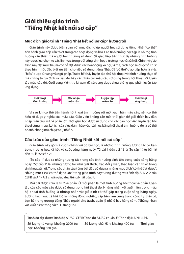 Giáo trình được biên soạn nhằm giúp người học giao tiếp bằng tiếng Nhật tốt hơn trong các hoạt động xã hội. Các tình huống học tập trong giáo trình là những tình huống thường được sử dụng để giao tiếp trên thực tế, được lựa chọn từ các lĩnh vực trong đời sống sinh hoạt, trường học và xã hội. Cách học được tổ chức theo hình thức đặc biệt ưu tiên việc "Giao tiếp" hơn là "Hiểu" từ vựng và ngữ pháp. [Hội thoại tình huống -> Xác nhận mẫu câu -> Luyện tập mẫu câu -> Hội thoại ứng dụng] Giáo trình bao gồm 2 sách giáo khoa sơ cấp 1, 2, hai quyển Work book sơ cấp 1,2 và 1 quyển Bản dịch và giải thích ngữ pháp.