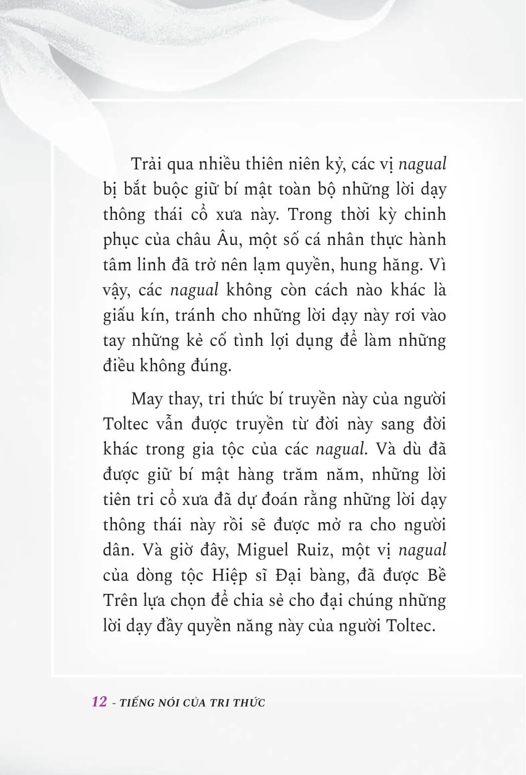 TIẾNG NÓI CỦA TRI THỨC Làn sương che mờ tâm trí Tri thức có che mờ tâm trí? Trong mỗi chúng ta có một Cây Tri thức, đó chính là hệ thống niềm tin của riêng mỗi người. Cây Tri thức là kết cấu của mọi điều mà ta tin vào. Mỗi quan niệm hay mỗi định kiến lại sinh ra một nhánh nhỏ, cho đến một ngày Cây Tri thức sinh trưởng vững chãi với cành lá sum suê. Ngay khi cái cây này bám chắc trong tâm trí ta, tiếng nói của thiên thần sa ngã trở nên ồn ào hơn bao giờ hết. Giờ thì gã Hoàng tử Dối trá ấy đang sống trong tâm trí ta – ký sinh trùng đã chiếm lấy cuộc sống của chúng ta làm vật chủ. Kẻ kể chuyện – ký sinh trùng, sinh sôi trong đầu ta, và nó tồn tại được là nhờ niềm tin mà ta trao cho nó. Không chỉ có thế – kẻ dối trá thao túng tâm trí chúng ta còn thèm khát được tuôn ra thật nhiều lời nói dối, được lan truyền câu chuyện của hắn càng xa càng tốt. Chúng ta chia nhau những quả mọng cám dỗ của Cây Tri thức, đồng nghĩa rằng kẻ dối trá này cũng mê hoặc tâm trí của những người quanh ta, và càng nhiều người có cùng niềm tin sai trái, sự dối trá lại càng thâu tóm được nhiều quyền năng ghê gớm hơn. Hậu quả là chúng ta thù hận nhiều hơn, căm ghét nhiều hơn, và chẳng ngại làm đau người khác. Chúng ta bao che và trở thành những kẻ cuồng tín đối với sự dối trá trong chính m.ình. Loài người thậm chí còn nhân danh sự dối trá ấy để tiêu diệt lẫn nhau. Ai đang sống cuộc đời của chúng ta vậy? Ai là người đang đưa ra những lựa chọn ở đây? Chắc hẳn bạn đã có câu trả lời rồi đấy. Tiếng nói của tri thức - Làn sương che mờ tâm trí Trong Tiếng nói của tri thức, don Miguel Ruiz nhắc nhở chúng ta về một sự thật sâu sắc và đơn giản: Cách duy nhất để chấm dứt đau khổ về cảm xúc và khôi phục lại niềm vui sống là ngừng tin vào những lời nói dối - chủ yếu là về bản thân. Dựa trên sự khôn ngoan của Toltec cổ xưa, cuốn sách phát triển bản thân này chỉ cho chúng ta cách khôi phục niềm tin vào sự thật và trở về với lẽ thường của chính m.ình. Ruiz dành nhiều thời gian để giải thích lý do tại sao anh ấy coi tất cả mọi người là nghệ sĩ tạo ra câu chuyện cuộc đời của họ, và làm thế nào để hai người có thể có những câu chuyện khác nhau trong cùng một hoàn cảnh. Trong thiết lập này, Ruiz coi tiếng nói của tri thức là tiếng nói của dối trá và lừa dối, kiểm soát và cản trở sự phát triển cá nhân và tâm linh của chúng ta cũng như mối liên hệ của chúng ta với Thần thánh hoặc ý thức thuần khiết. Ruiz cho rằng sự không hoàn hảo của chúng ta là lời nói dối lớn nhất mà chúng ta đã được cho ăn khi còn nhỏ. Chúng ta có thể tạo ra sự khác biệt to lớn cho sức khỏe tinh thần của các thế hệ sắp tới chỉ đơn giản bằng cách đảm bảo rằng tất cả những "lời nói dối" của chúng ta đều kết thúc với chúng ta. Có lẽ do thực tế là Ruiz đi ngược lại ý nghĩa tích cực thường được nhắc đến của từ "tri thức". Ruiz dành nhiều thời gian để xây dựng kịch bản (khoảng một phần tư cuốn sách) bằng cách sử dụng các câu chuyện (ví dụ như viết lại câu chuyện của A-đam và Ê-va), và đưa ra lý do tại sao tiếng nói của tri thức không được tin cậy. Khi gấp lại cuốn sách, bạn sẽ bị ấn tượng với tính toàn vẹn của thông điệp của tác giả. Cuốn sách được viết đơn giản với nhiều ví dụ từ cuộc sống của chính anh ấy minh họa cho những cuộc đấu tranh cá nhân, những bước đột phá và sự phục hồi niềm tin cuối cùng của Ruiz. Ruiz đến từ một hàng dài những người nagual (bậc thầy) từ cộng đồng Toltec ở miền Nam Mexico. Cuộc hành trình của anh ấy từ một thanh niên trẻ dễ bị tổn thương nhưng sắc bén trở thành một bác sĩ phẫu thuật vật lộn với trải nghiệm cận kề cái chết của m.ình, và để nắm lấy trí tuệ Toltec cuối cùng cùng những lời dạy của ông nội và mẹ anh ấy đặc biệt sâu sắc. Cuối mỗi chương, tác giả tổng hợp những điều cần suy ngẫm để bạn dễ dàng nhớ và các công cụ Ruiz cung cấp ở cuối cuốn sách đặc biệt có giá trị và được xây dựng dựa trên Bốn thỏa ước. Ruiz tôn trọng bốn thỏa ước này, và cho rằng chúng có tác dụng như bùa chú chống lại sự suồng sã và dối trá bao quanh chúng ta. Hãy trải nghiệm Tiếng nói của tri thức - Làn sương che mờ tâm trí để nhìn nhận bản thân và cách chúng ta nhìn nhận người khác nhé!