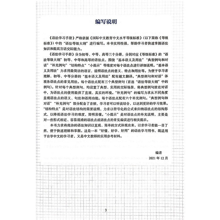 Giáo trình ngữ pháp gồm ba quyển là sơ cấp, trung cấp và cao cấp, được biên soạn theo hướng bám sát Đề cương ngữ pháp của Bộ tiêu chuẩn phân cấp trình độ giáo