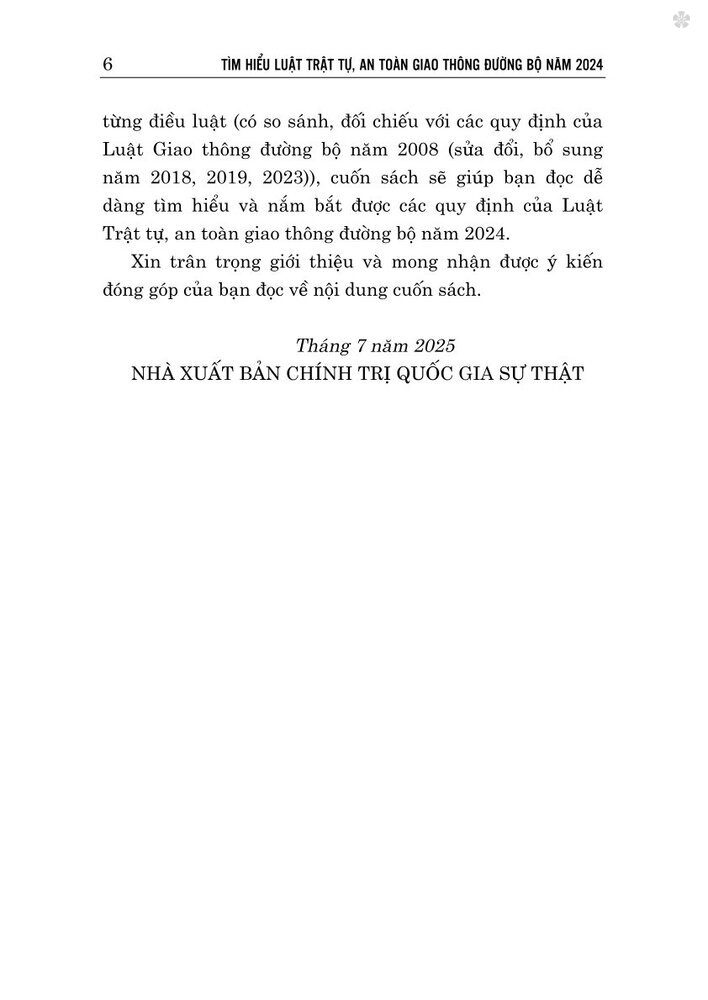 Mua tại TiktokNhằm góp phần tuyên truyền, phổ biến những nội dung cơ bản của Luật Trật tự, an toàn giao thông đường bộ năm 2024, Nhà xuất bản Chính trị quốc gia Sự thật xuất bản cuốn sách Tìm hiểu Luật Trật tự, an toàn giao thông đường bộ năm 2024 do Luật sư Trương Ngọc Liêu biên soạn.