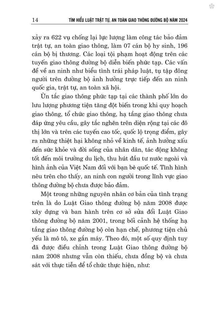 Qua việc phân tích ngắn gọn nội dung trong từng điều luật (có so sánh, đối chiếu với các quy định của Luật Giao thông đường bộ năm 2008 (sửa đổi, bổ sung năm 2018, 2019, 2023)), cuốn sách sẽ giúp bạn đọc dễ dàng tìm hiểu và nắm bắt được các quy định của Luật Trật tự, an toàn giao thông đường bộ năm 2024.