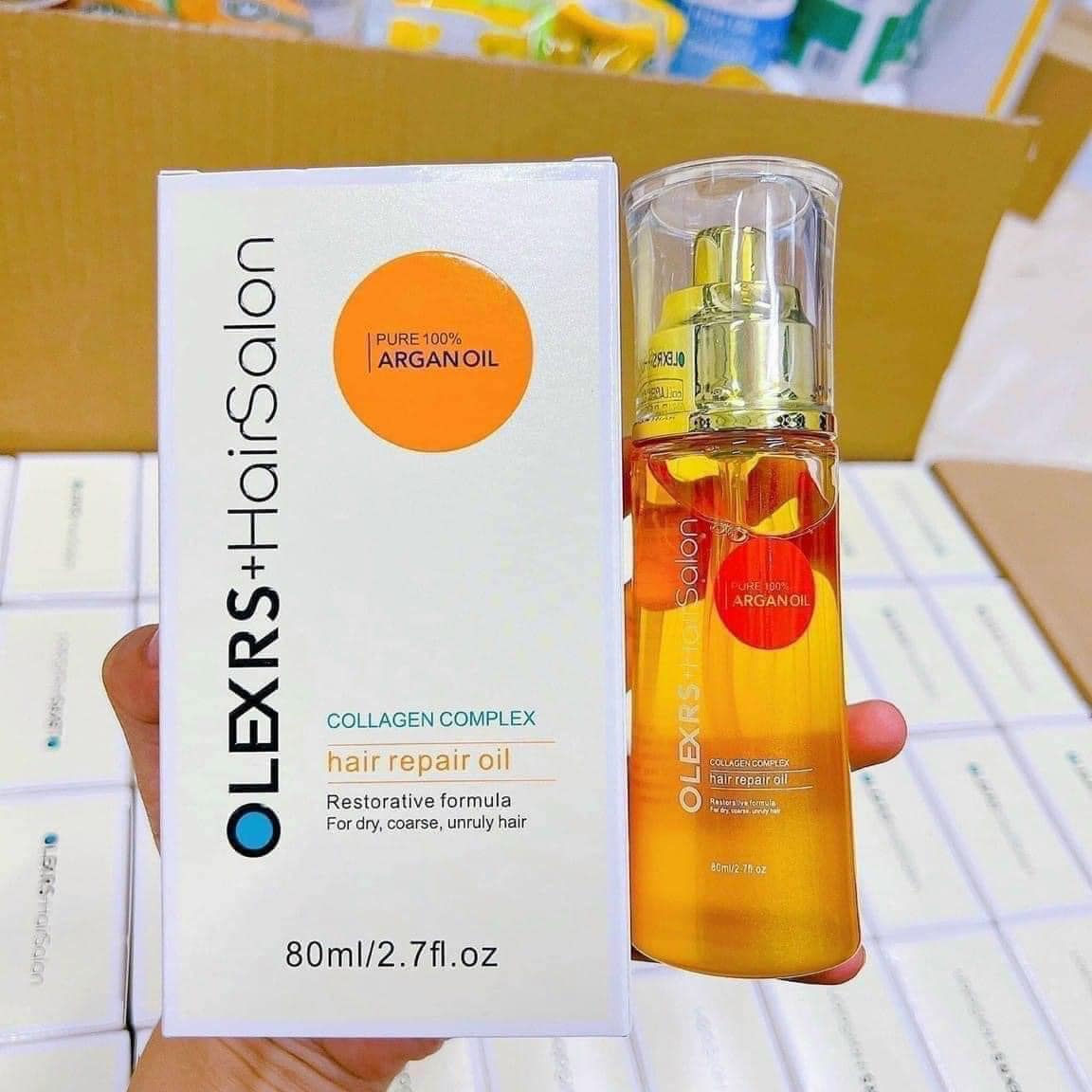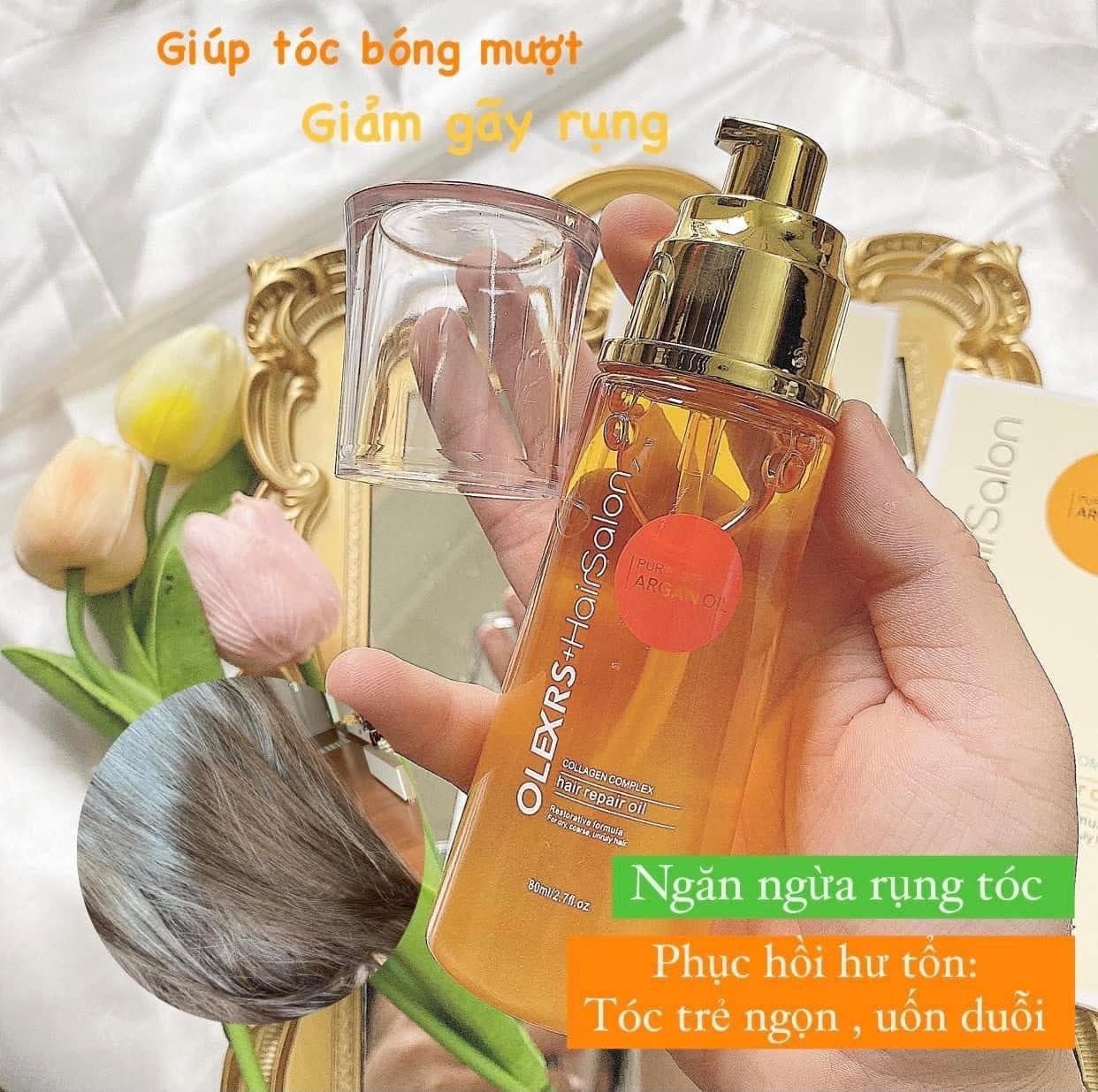 Mua tại TiktokThương hiệu: Olexrs Xuất xứ: Anh Dung tích: 80ml Tinh dầu dưỡng tóc Olexrs Hairsalon Pure 100% Argan Oil Collagen Complex Hair Repair Oil giúp phục hồi tóc hư tổn nặng, xơ, khô, chẻ ngọn, gãy rụng, hư tổn do nhuộm tóc, ép tóc, uốn tóc,úp mọc tóc chắc khỏe, tóc sáng bóng, cân bằng độ ẩm, loại bỏ tĩnh điện, chống tia UV. Ưu điểm: