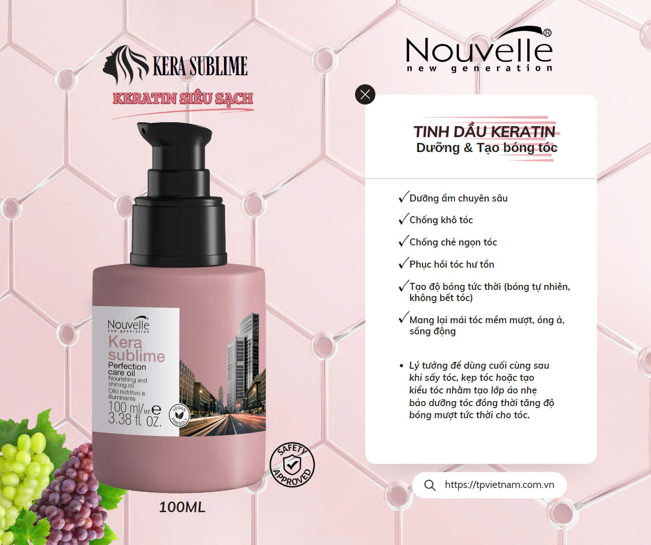 Mua tại TiktokCông dụng:Với công thức tiên tiến chứa các thành phần có nguồn gốc thiên nhiên đặc biệt là các dưỡng chất chiết xuất từ hạt nho giúp tóc cân bằng độ ẩm, mềm mượt và óng ả. Sử dụng tinh dầu vào bước cuối cùng sau khi sấy kẹp tạo kiểu tóc để tạo lớp áo nhẹ bảo dưỡng tóc đồng thời tăng độ bóng cho tóc. Tinh dầu mang lại mái tóc bóng mượt tự nhiên, không bết tóc. Cách sử dụng:Sử dụng trên tóc khô. Cho vài giọt tinh dầu ra lòng bàn tay, rồi xoa hai lòng bàn tay vào nhau, sau đó vuốt 2 lòng bàn tay lên tóc. Dung tích: 100ml