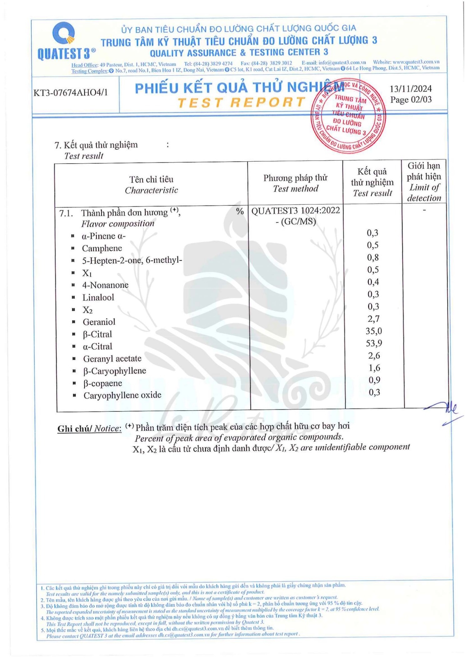 ► THÀNH PHẦN: 100% tinh dầu sả chanh hữu cơ với các thành phần chính như: Geranial - Citral A (35-47%), Neral - Citral B (25-40%), Geranyl acetate (0,5-6,0%), Geraniol (1,5-8,0%). Quét mã QR để xem kết quả phân tích GC-MS về hàm lượng của các thành phần trong tinh dầu.