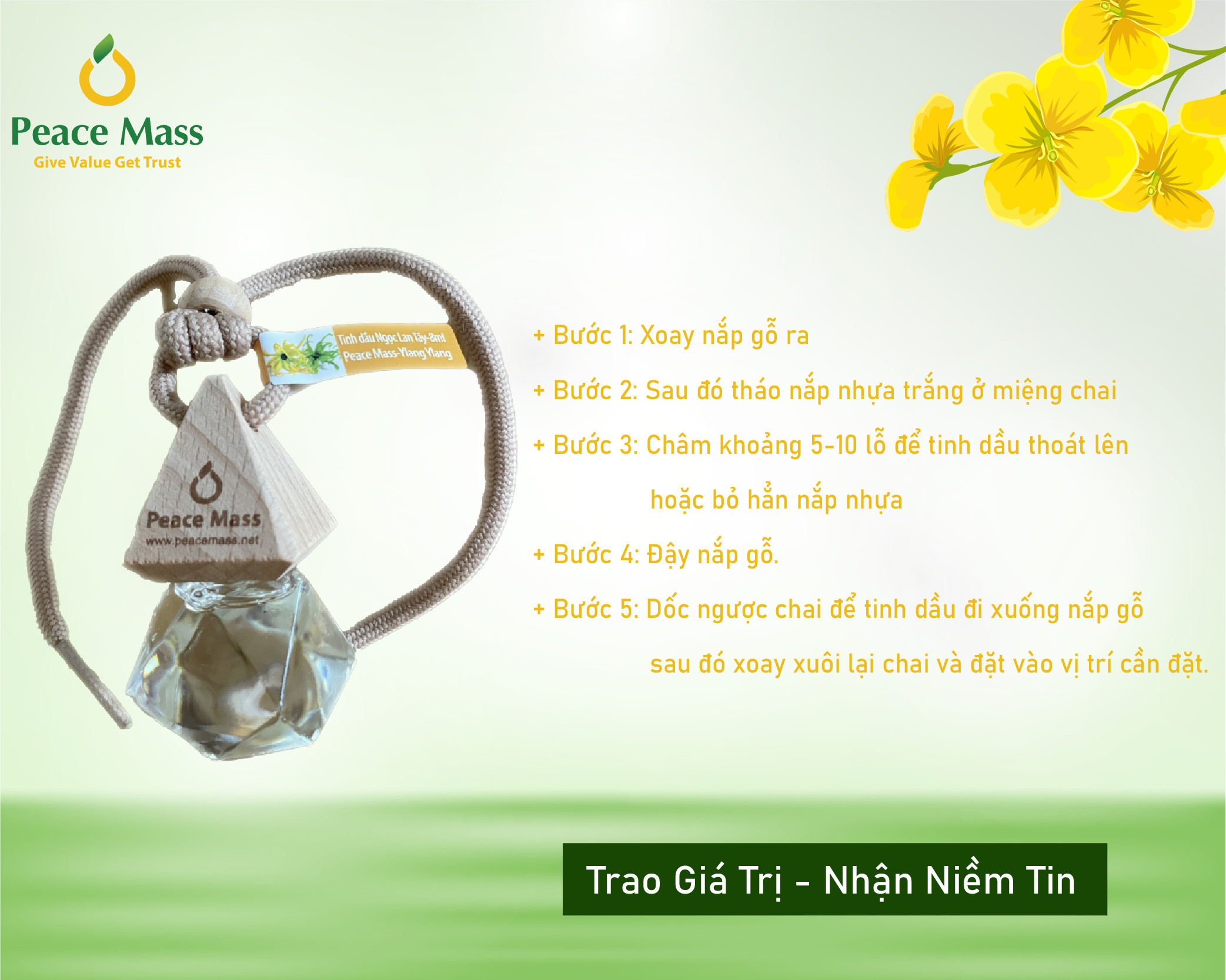 Tinh dầu Ngọc Lan Tây Peace Mass – Ylang Ylang - Nguyên liệu: nhập khẩu - Dung tích: 8ml - Vị trí sử dụng: Treo trên ô tô, trong tủ quần áo, phòng khách, phòng