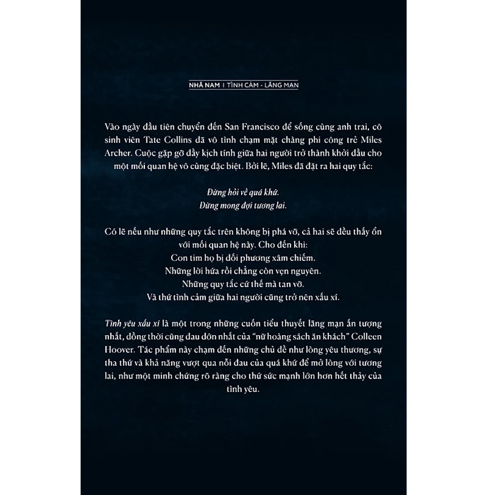 Tình yêu xấu xí là một trong những cuốn tiểu thuyết lãng mạn ấn tượng nhất, đồng thời cũng đau đớn nhất của "nữ hoàng sách ăn khách" Colleen Hoover. Tác phẩm này chạm đến những chủ đề như lòng yêu thương, sự tha thứ và khả năng vượt qua nỗi đau của quá khứ để mở lòng với tương - lai, như một minh chứng rõ ràng cho thứ sức mạnh lớn hơn hết thảy của tình yêu.