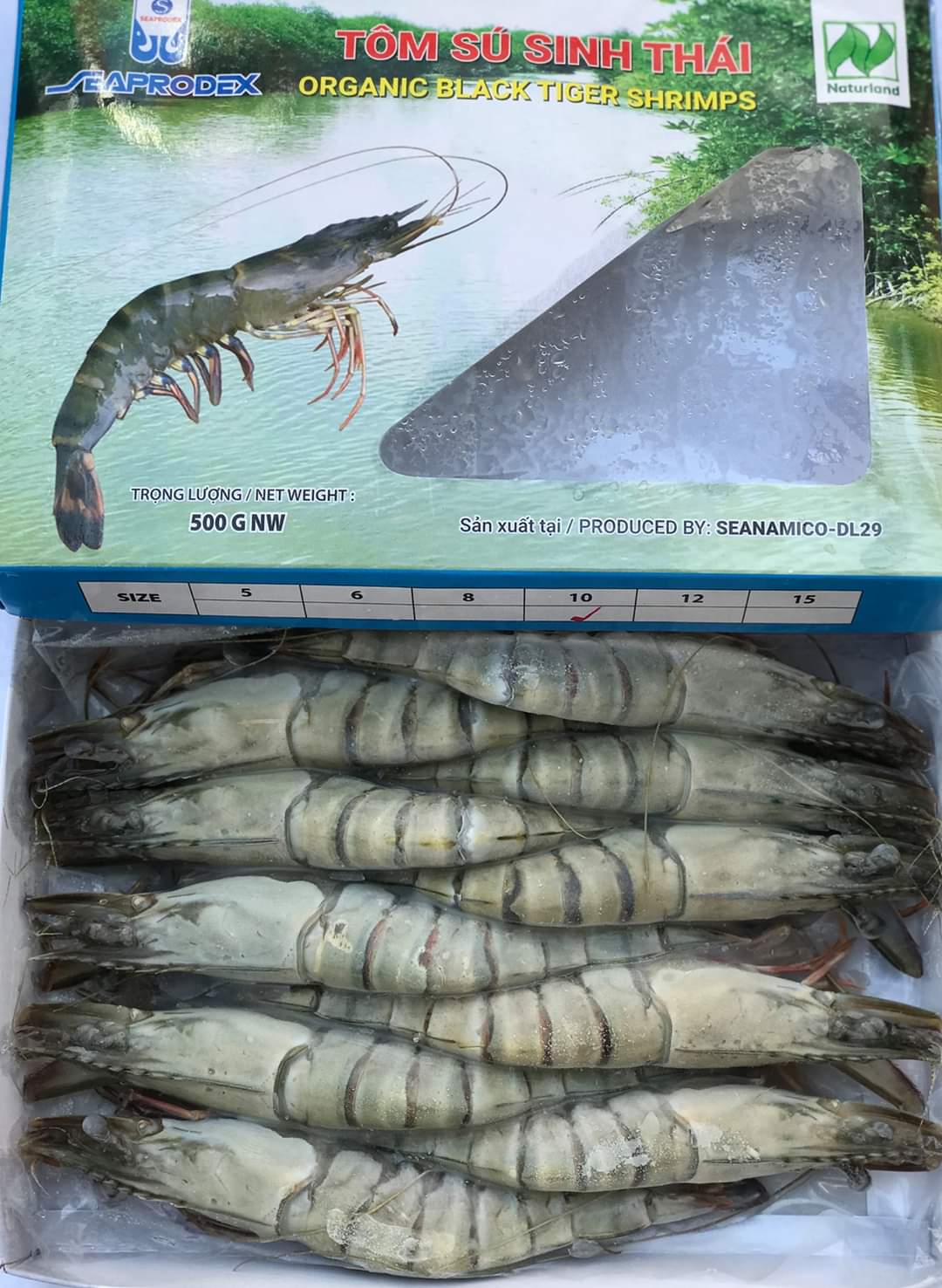 Tôm sú nguyên con sinh thái Seaprodex kích cỡ 10 con/hộp, 500gr ( Hộp màu xanh cam là hộp bao bì mới của Seaprodex)
