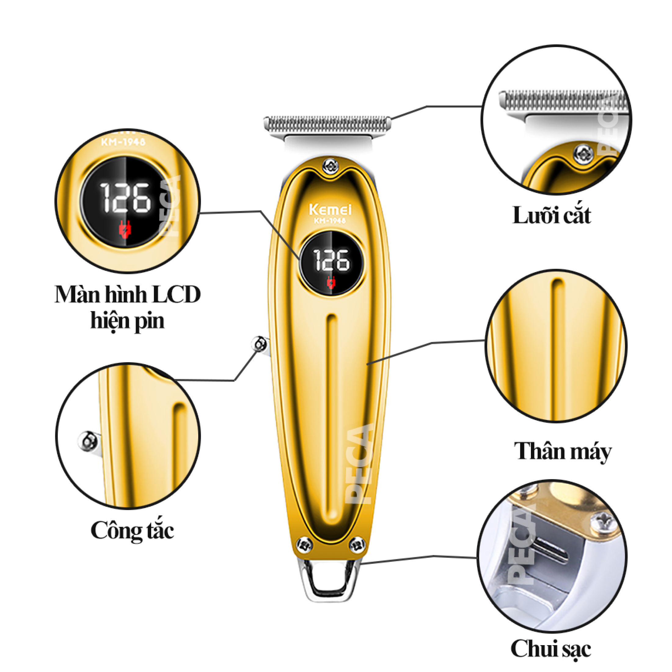Tông đơ chấn viền không dây màn hình LCD chuyên nghiệp Kemei KM - 1948 full inox Hai màu VÀNG - TRẮNG sang trọng tiện lợi lựa chọn - Tông đơ cắt tóc Kemei 1948