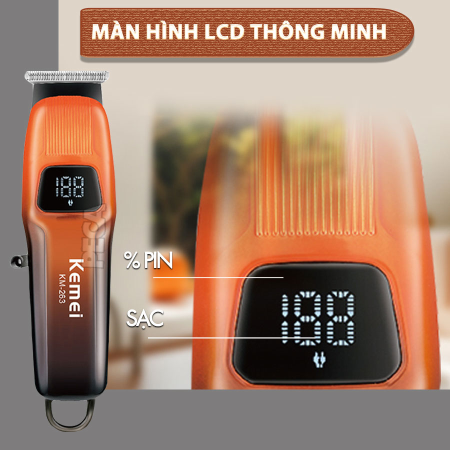 TÔNG ĐƠ CHẤN VIỀN KEMEI KM-263 MÀN HÌNH LCD, CÔNG SUẤT MẠNH 5W - CHÍNH HÃNG Máy cạo râu Kemei KM-263 là sản phẩm đa dụng, tích hợp nhiều tính năng vượt trội, giúp phái mạnh chăm sóc ngoại hình một cách dễ dàng và hiệu quả. Phù hợp sử dụng cá nhân, salon tiệm tóc dùng để cạo đầu, chấn viền, khắc tattoo tóc, tạo kiểu,... ƯU ĐIỂM NỔI BẬT :     1/ Ngoại quan sản phẩm: