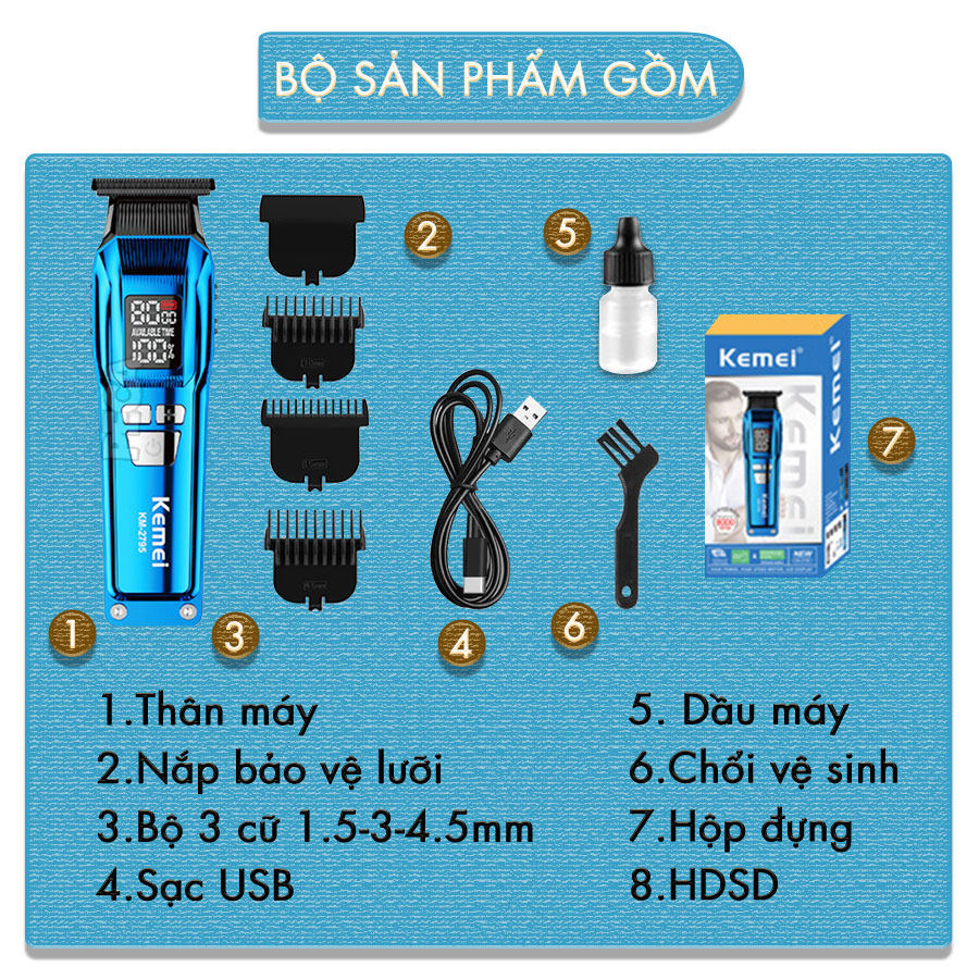 TÔNG ĐƠ CHẤN VIỀN PHIÊN BẢN CAO CẤP KEMEI KM-2795 LƯỠI MẠ CARBON DLC CAO CẤP, CÔNG SUẤT MẠNH MẼ 8W - CHÍNH HÃNG Máy cạo râu Kemei KM-2795 là sản phẩm chuyên nghiệp, tích hợp nhiều tính