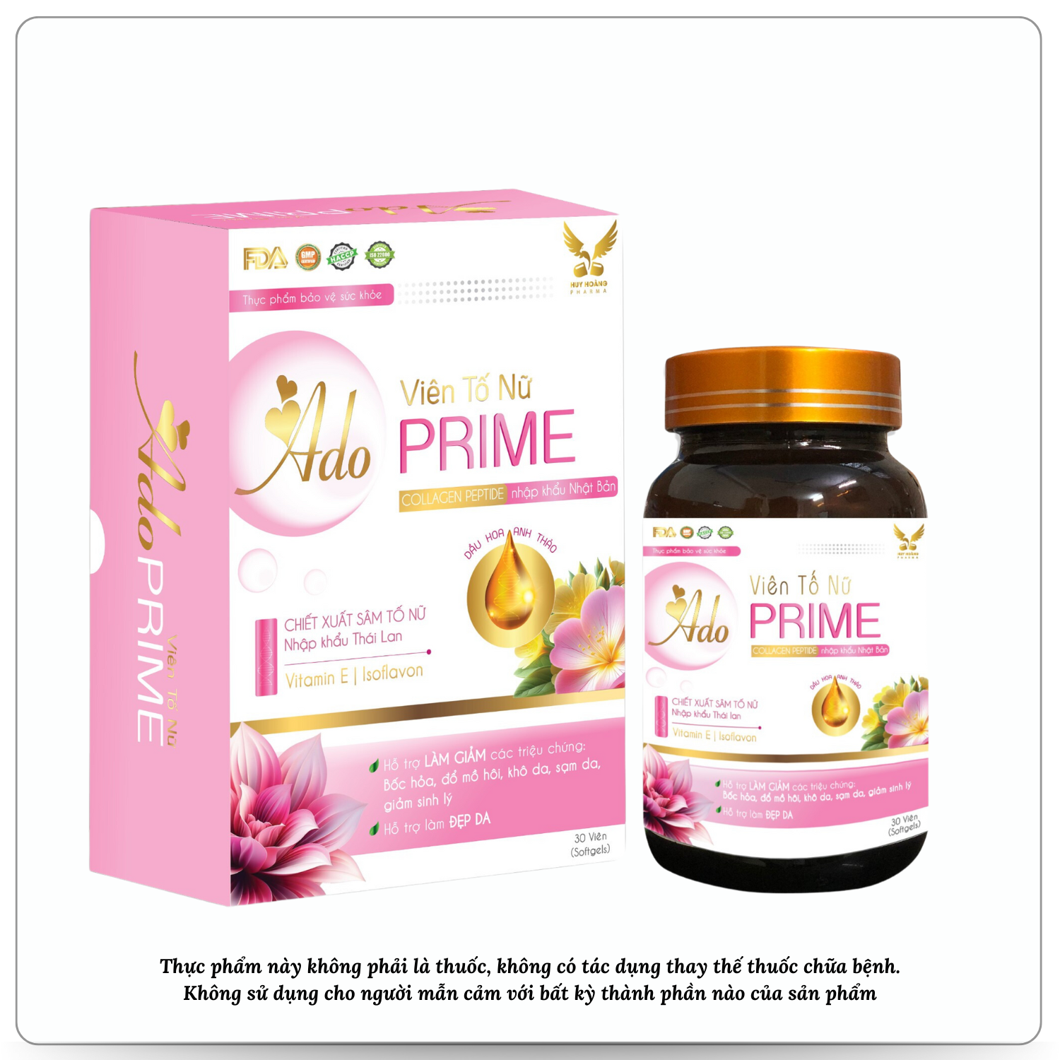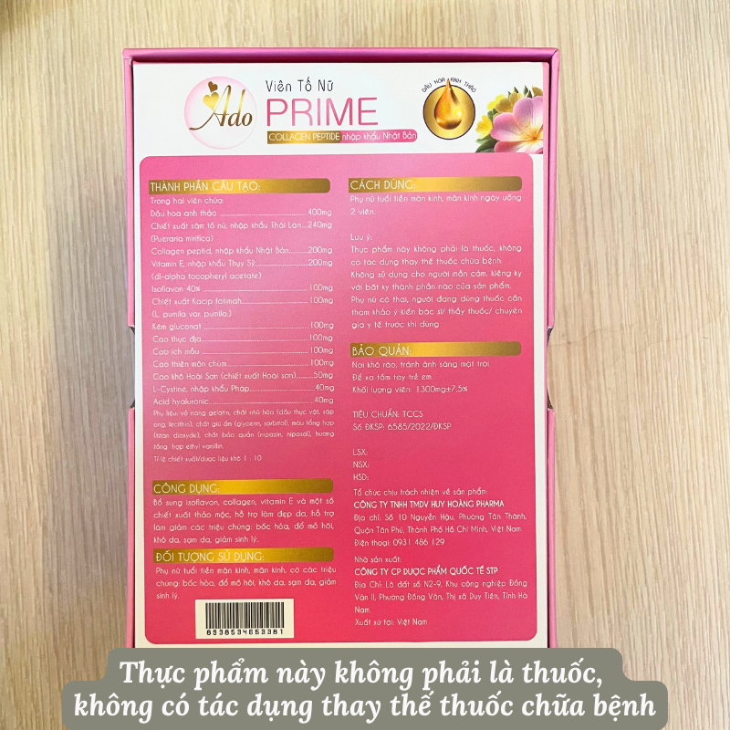 Ado Prime bổ sung isoflavon, collagen, vitamin E và một số chiết xuất thảo mộc, hỗ trợ làm đẹp da, hỗ trợ làm giảm các triệu chứng: bốc hỏa, đổ mồ hôi, khô da, sạm da, giảm sinh lý. TRONG SẢN PH...