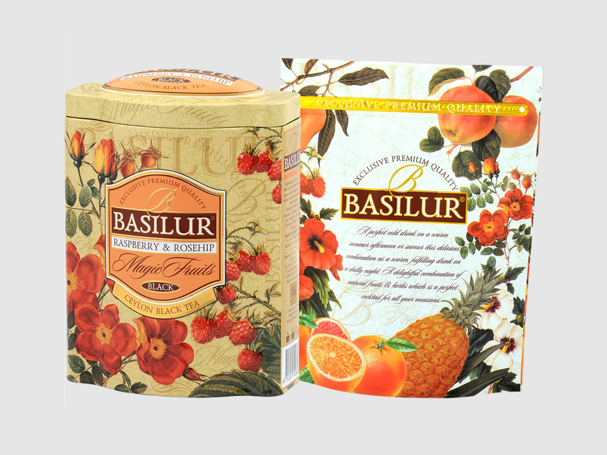 Trà đen Basilur Magic Fruits Raspberry & Rosehip cao cấp được sản xuất từ 100% lá trà đen Ceylon tinh khiết, quả mâm xôi, quả đu đủ, vỏ quả tầm xuân, hoa cúc vạn thọ, hoa cúc ngô, mứt khô từ quả mâm xôi. Đây là một hỗn hợp trà đen Ceylon nguyên chất kết hợp với trái cây tự nhiên & vỏ hạt tầm xuân và mứt khô từ quả mâm xôi sẽ là thức uống rất tốt cho sức khỏe. Công dụng của hàm lượng Vitamin C cao, vỏ hạt tầm xuân đã được chứng minh trong nhiều thế kỷ. Loại trà đen Ceylon Basilur Magic Fruits cao cấp này sở hữu mùi hương ấm áp kể cả dùng ấm hoặc với đá.