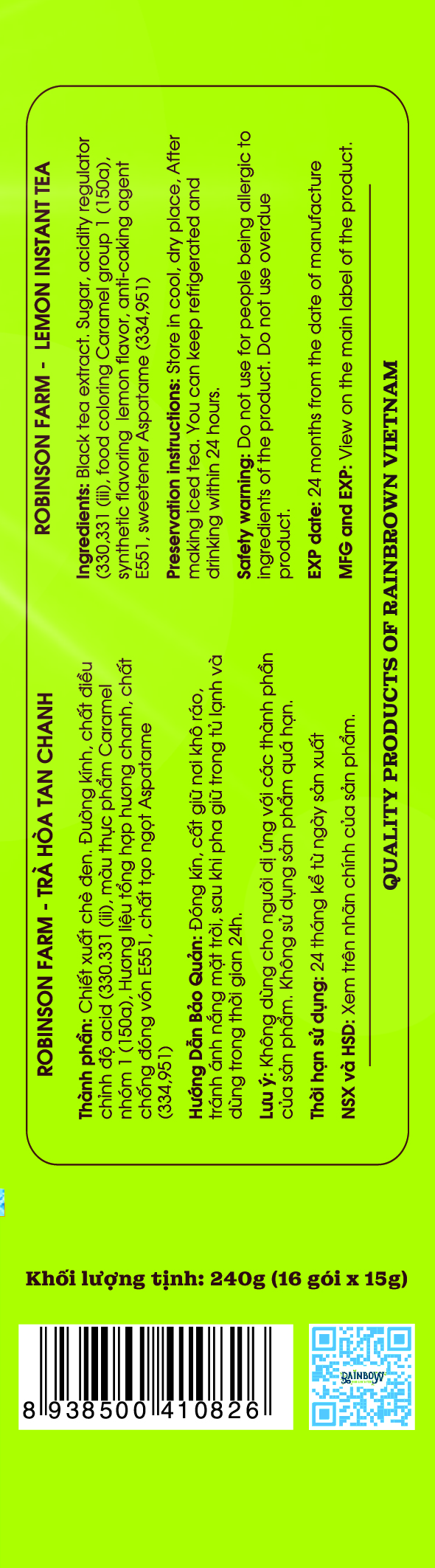 Thành phần : Đường kính, chất điều chỉnh độ axit, màu thực phẩm, hương chanh tự nhiên, chất chống đóng vón, chất tạo ngọt, chiết xuất chè đen (0.04%)