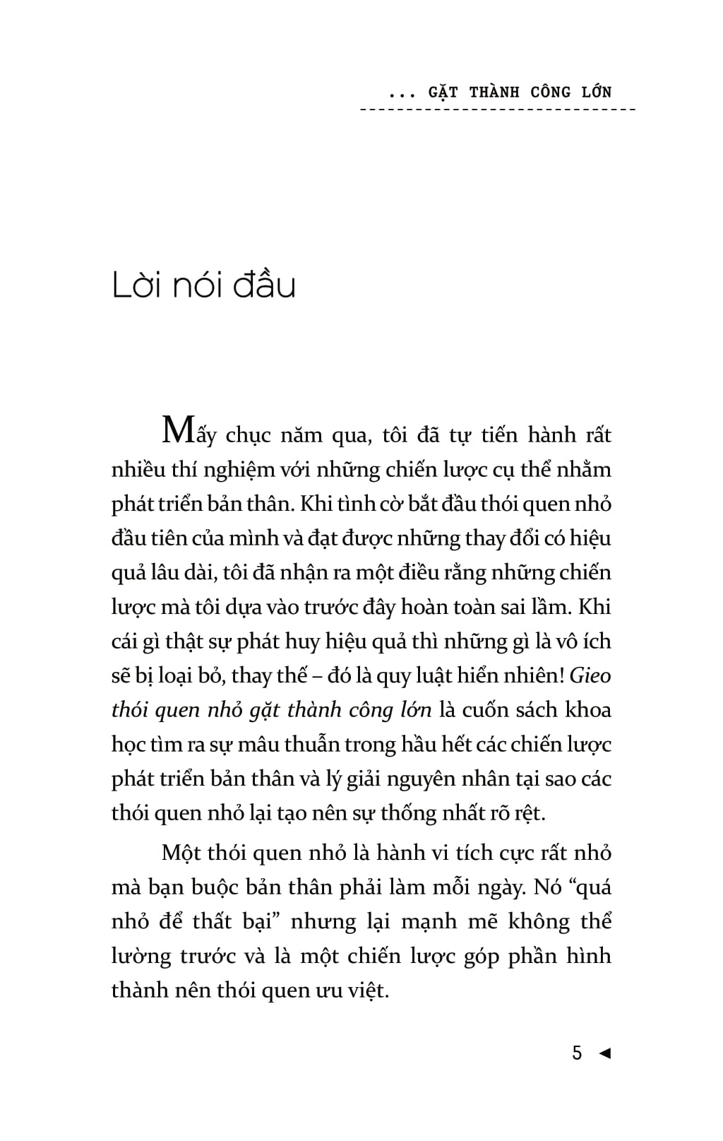 Mọi người thường nghĩ, chính họ là nguyên nhân khiến bản thân không thể đạt được sự thay đổi lâu dài. Nhưng vấn đề ở đây không phải là bản thân họ mà là chiến lược của họ. Bạn có thể đạt được những thành công to lớn mà không chịu bất cứ áp lực nào và sẽ không lặp lại thất bại nhờ những cách thức, phương pháp kiểu như: “lấy động lực”, sự kiên trì, và thậm chí là “làm đại đi”. Để đạt được những thay đổi lâu dài, bạn đừng cưỡng lại bộ não của mình. Khi bạn bắt đầu làm theo những chỉ thị của não bộ – theo dẫn dắt từ Gieo thói quen nhỏ gặt thành công lớn – thì những thay đổi tích cực, lâu dài sẽ không khó để đạt được! Gieo thói quen nhỏ gặt thành công lớn  là cuốn sách khoa học tìm ra sự mâu thuẫn trong hầu hết các chiến lược phát triển bản thân và lý giải nguyên nhân tại sao các thói quen nhỏ lại tạo nên sự thống nhất rõ rệt. Một thói quen nhỏ là hành vi tích cực rất nhỏ mà bạn bắt bản thân phải làm mỗi ngày. Nó “quá nhỏ để thất bại” nhưng lại mạnh mẽ không thể lường trước và là một chiến lược góp phần hình thành nên thói quen ưu việt.Cuốn sách gồm có bảy phần chính. Ba phần đầu của cuốn sách bàn về việc xây dựng thói quen, bộ não, ý chí, động lực và chỉ ra cách chúng liên hệ với nhau. Hai phần tiếp theo bàn về các kết luận mang tính lô-gic và cách khai thác một cách khoa học nhất những thông tin cung cấp. Ba phần cuối hướng dẫn bạn áp dụng những cách thức đó trong cuộc sống.Chiến lược này sẽ giúp cuộc sống của bạn trở nên hoàn hảo hơn 99% số người sống trên hành tinh này.