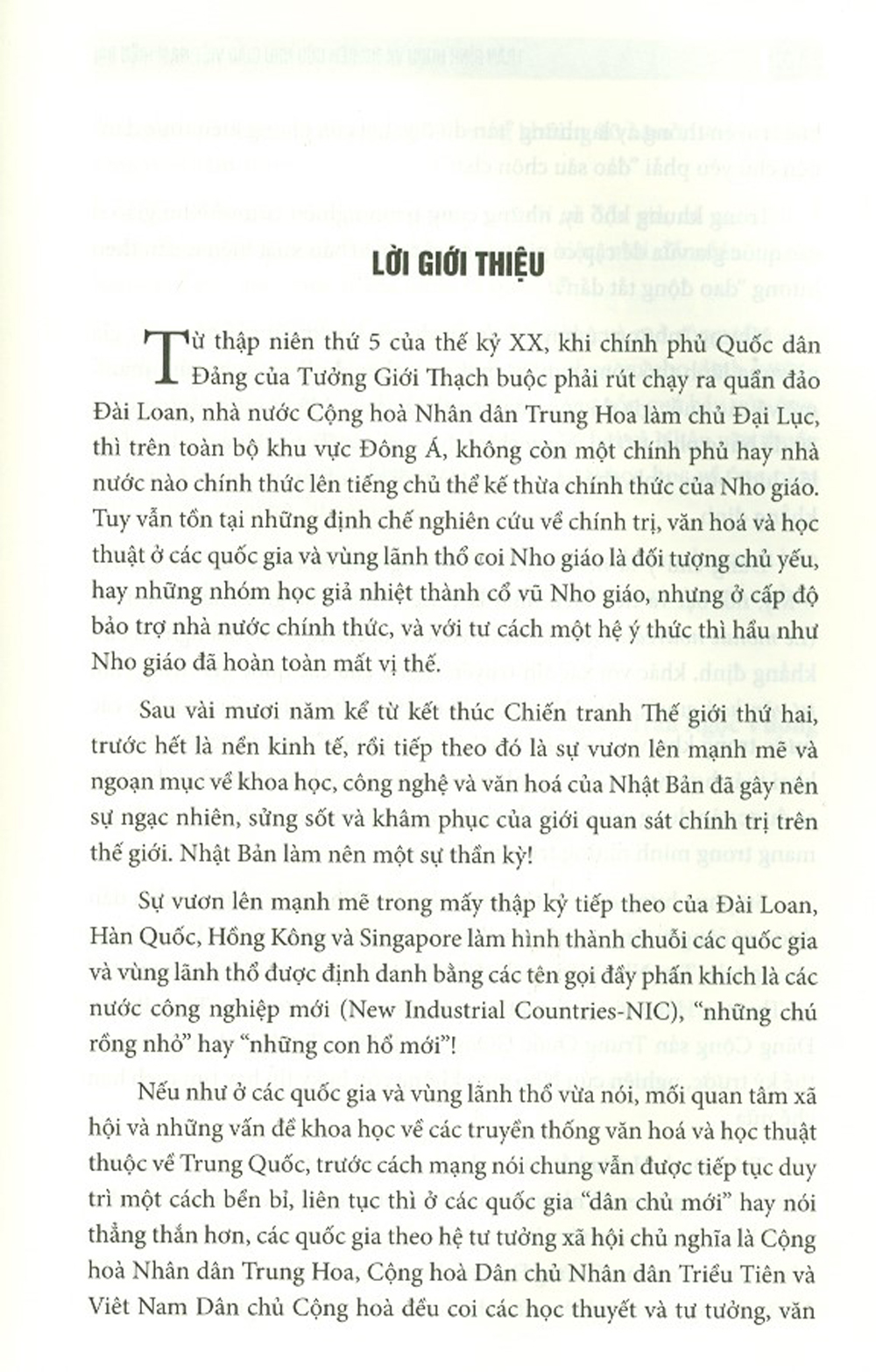 Từ thập niên thứ 5 của thế kỷ XX, khi chính phủ Quốc dân Đảng của Tưởng Giới Thạch buộc phải rút chạy ra quần đảo Đài Loan, nhà nước Cộng hoà Nhân dân Trung Hoa làm chủ Đại Lục, thì trên toàn bộ khu vực Đông Á, không còn một chính phủ hay nhà nước nào chính thức lên tiếng chủ thể kế thừa chính thức của Nho giáo. Tuy vẫn tồn tại những định chế nghiên cứu về chính trị, văn hoá và học thuật ở các quốc gia và vùng lãnh thổ coi Nho giáo là đối tượng chủ yếu, hay những nhóm học giả nhiệt thành cổ vũ Nho giáo, nhưng ở cấp độ bảo trợ nhà nước chính thức, và với tư cách một hệ ý thức thì hầu như Nho giáo đã hoàn toàn mất vị thế. | Sau vài mươi năm kể từ kết thúc Chiến tranh Thế giới thứ hai, trước hết là nền kinh tế, rồi tiếp theo đó là sự vươn lên mạnh mẽ và ngoạn mục về khoa học, công nghệ và văn hoá của Nhật Bản đã gây nên sự ngạc nhiên, sửng sốt và khâm phục của giới quan sát chính trị trên thế giới. Nhật Bản làm nên một sự thần kỳ!