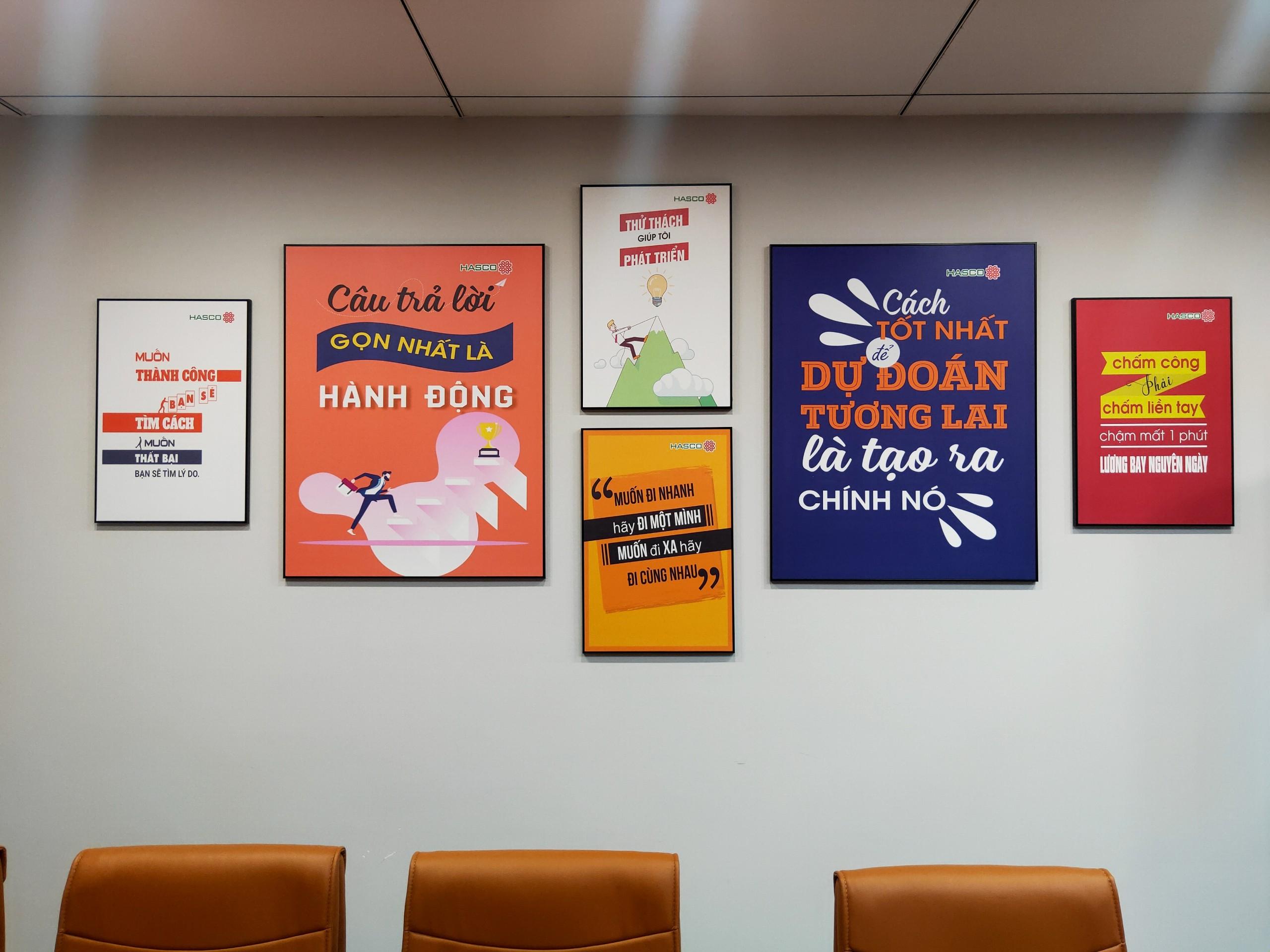Trong những không gian cần có sự trang trọng hơn thì tranh slogan được đóng khung là một trong các lựa chọn tối ưu.