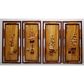 Tranh ghép gỗ nghệ thuật – xuân hạ thu đông – TÙNG CÚC TRÚC Tranh được chế tác bằng gỗ bạch tùng khung tranh gỗ hương và nhiều loại gỗ quý ,sơn Pu cao cấp