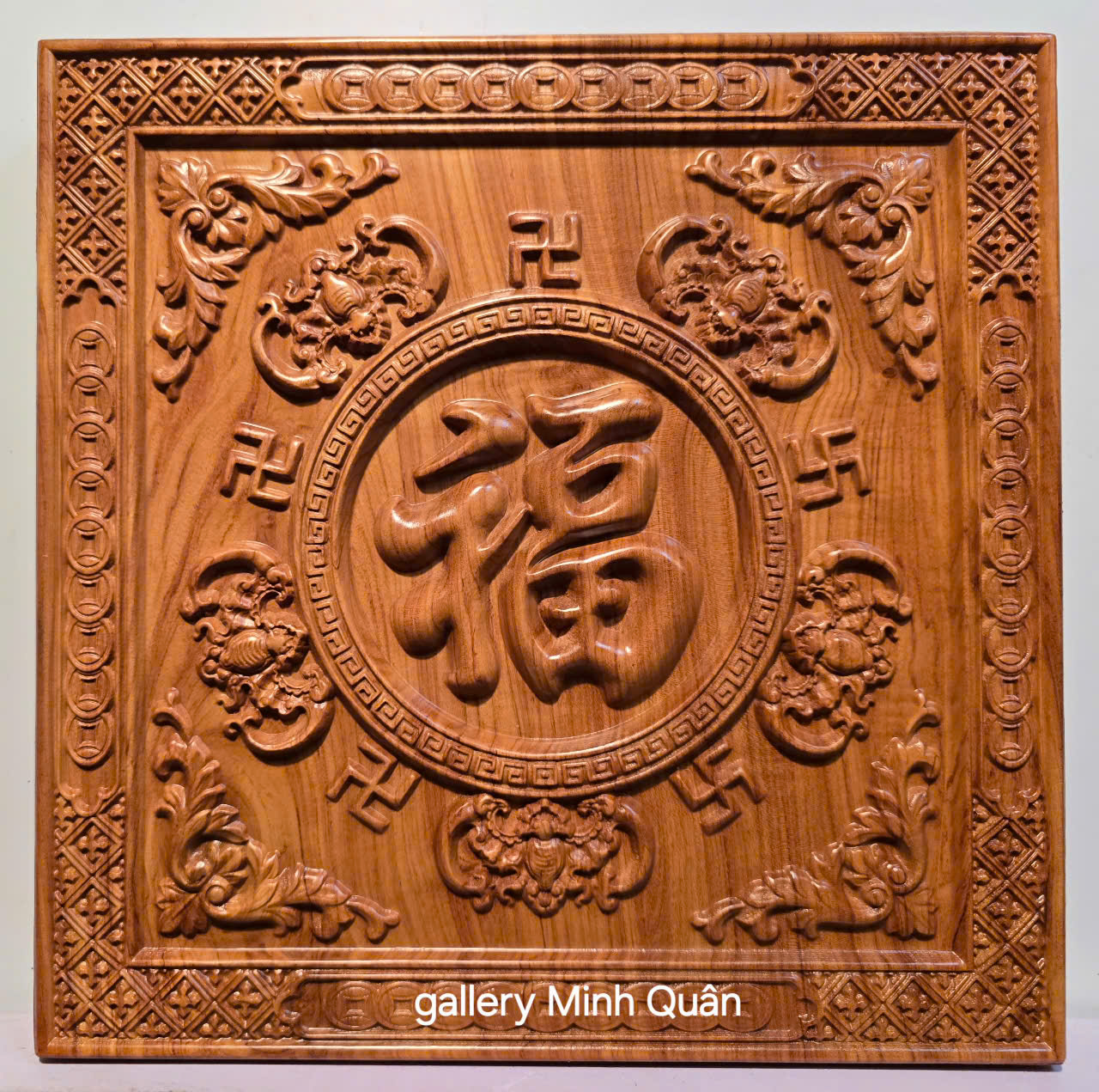 _ Tranh chữ phúc được làm bằng chất liệu gỗ gõ tự nhiên 100% _ Kt mặt vuông 61×61×4cm _ Tranh được khắc nổi tỉ mỉ ,tinh xảo kỳ công .Từ những người thợ giàu
