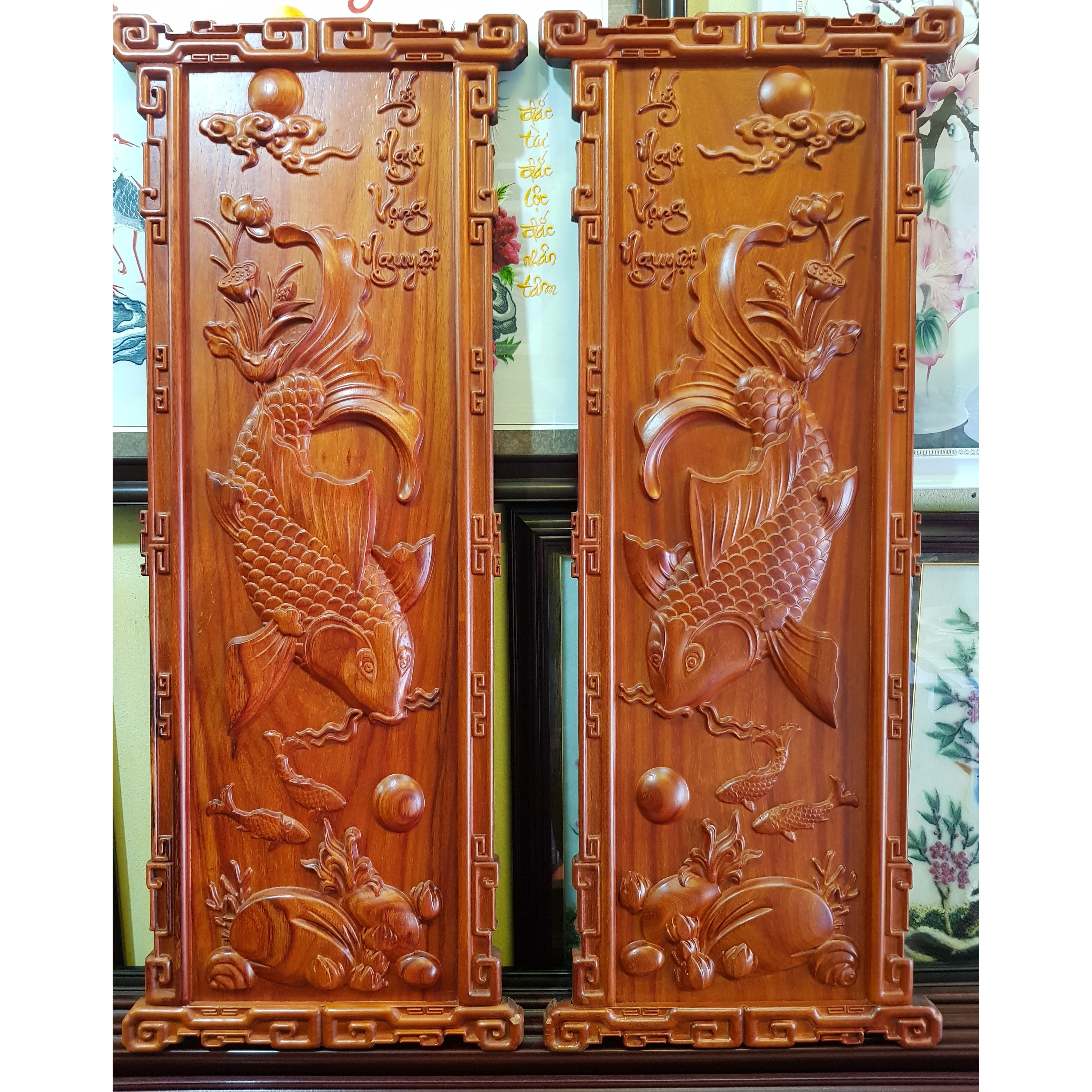 Cặp Tranh Cá gỗ hương đỏ - tranh Lý Ngư Vọng Nguyệt. 0986039040