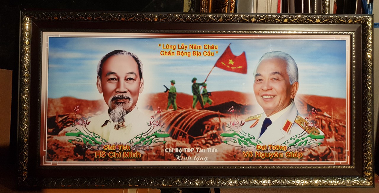 Ảnh gốc Chủ tịch Hồ Chí Minh – Đại tướng Võ Nguyên Giáp -Đ.c Trường Chinh – Đ.c Phạm Văn Đồng Chất liệu tranh in dầu trên lụa cao cấp được phủ lớp pe bảo