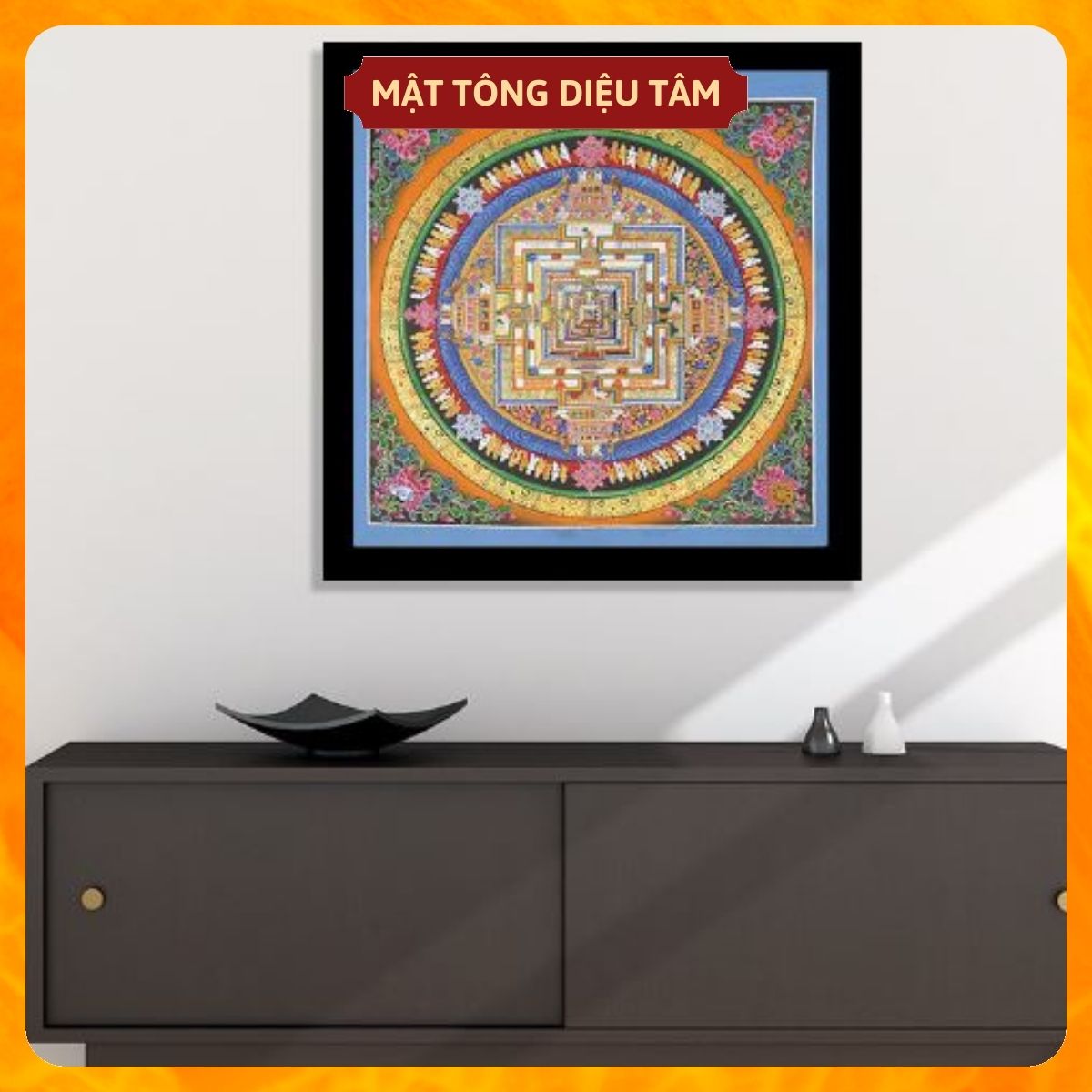 -Cách treo: Phù hợp treo ở phòng thờ, phòng khách, bàn làm việc, làm quà tặng tân gia, sinh nhật, Việc treo một bức Mandala trong nhà tốt hơn bất kì sự sắp đặt phong thuỷ cầu kì nào. Không những thế, tranh còn mang ý nghĩa nghệ thuật, tô điểm cho căn nhà, cửa hà mang đến bình an, may mắn cho những ai có cơ duyên ngắm nhìn!