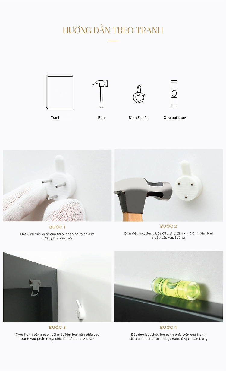 — Chất liệu: Vải Canvas — Khung: Tấm Formex cứng dầy 1cm —Quy cách: Tranh vải bọc khung Formex cứng được cố định bằng ốc vít. Sử dụng móc treo tường hoặc giá chân để