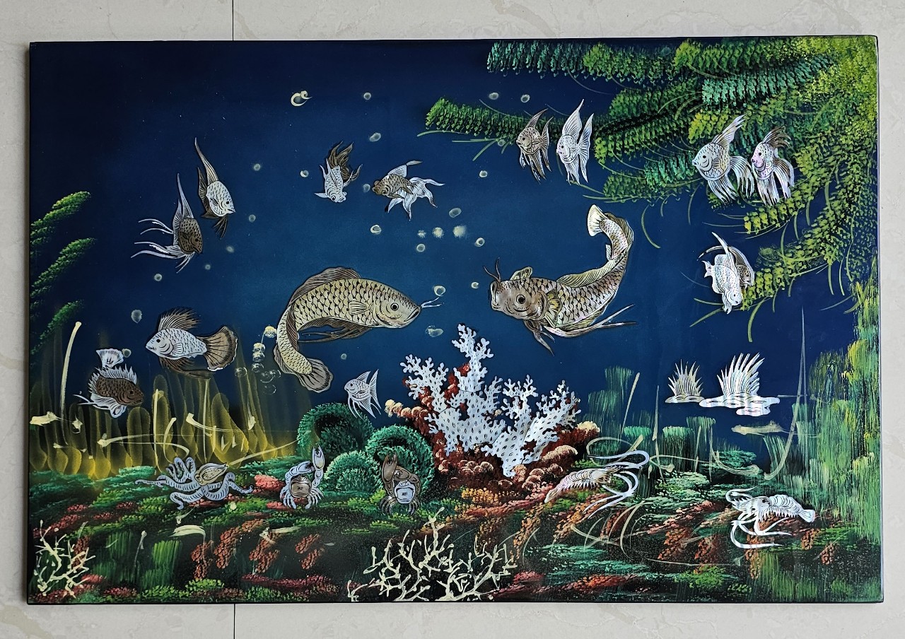 Tranh vẽ sơn mài – CỬU NGƯ QUẦN TỤ -CÁ CHÉP HOA SEN Chất liệu sơn mài trên gỗ,dày 1cm thếp vàng, bạc, vỏ trứng cực tinh xảo Khung vân gỗ nghệ thuật, chất liệu
