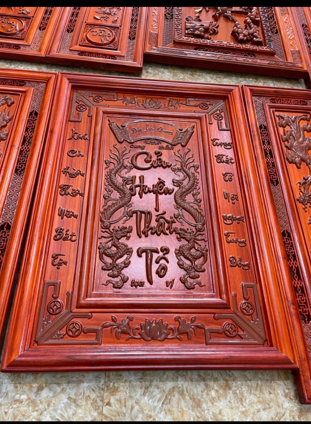 LIỄN THỜ THỔ TIÊN - CỬU HUYỀN THẤT TỔ ( Gỗ hương đá) Chất liệu; gỗ hương đá lục lạc , sơn pu chất lượng cao, mạ vàng Đài Loan Kích thước dày 3,5cm *cao