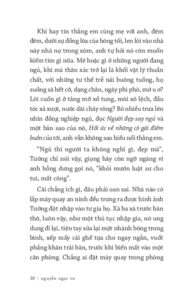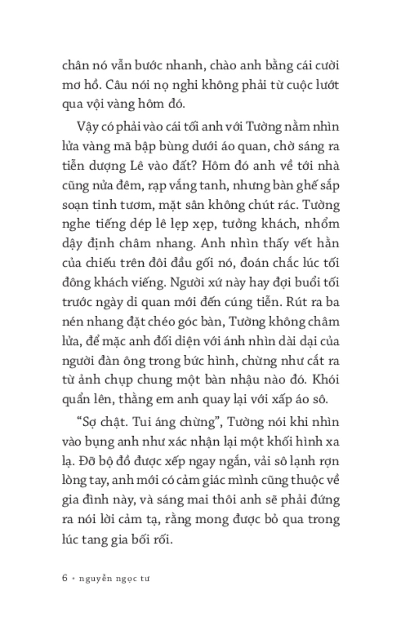 “Em thà trôi một mình. Nhưng những gì còn sót lại của một cù lao phân rã chẳng là bao. Vài ba mái nhà lấp ló trên mặt nước, một vài cái , những rẻo đất đủ rộng cho một người ngồi thì cũng có, lại trôi đờ đẫn đằng xa. Mãi mới có mảnh đất trôi gần, đúng lúc nó rùng mình nứt làm hai.