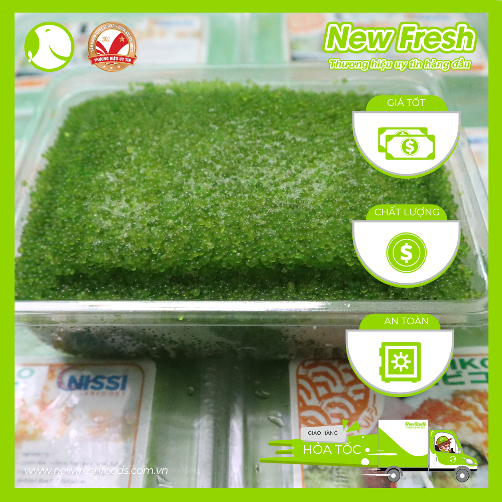 Với sản phẩm tươi sống, trọng lượng thực tế có thể chênh lệch khoảng 10%. Tên sản phẩm: Trứng tôm Tobiko xanh Xuất xứ: Nhật Bản Quy cách đóng gói: 500gram/hộp; Bảo quản: nhiệt độ