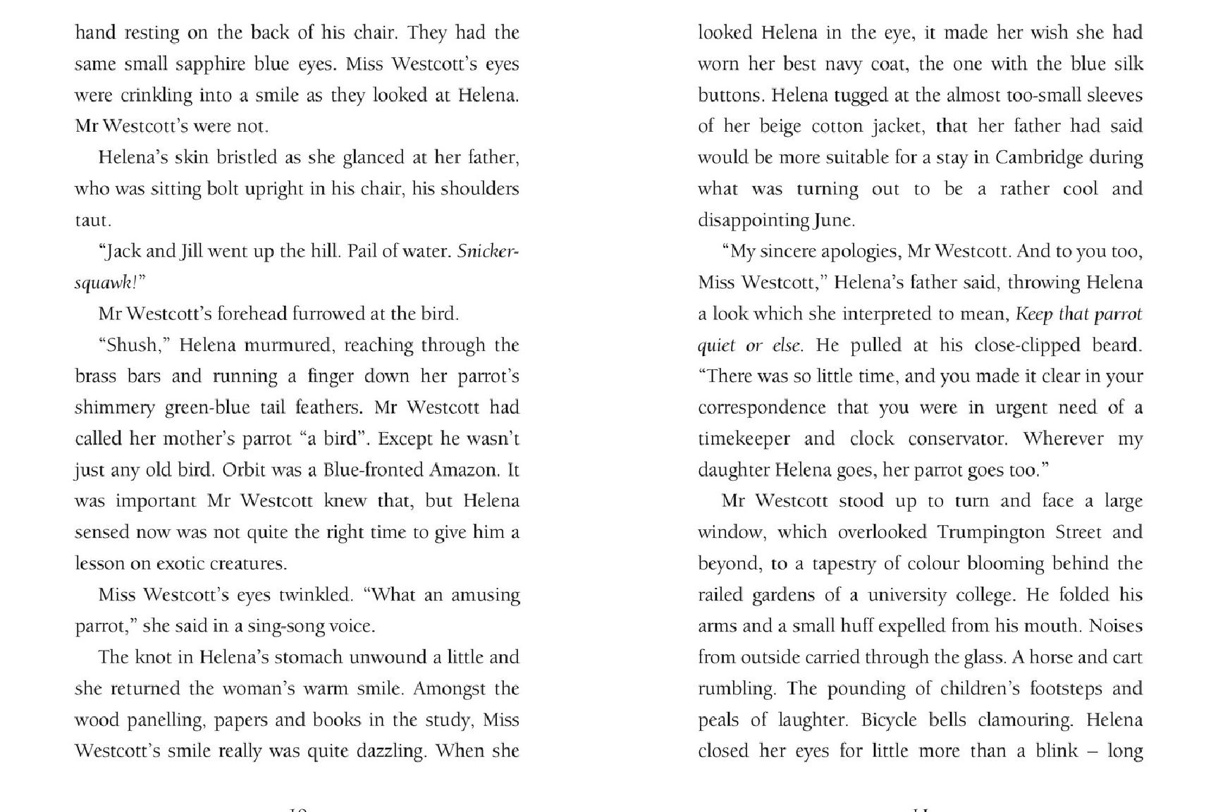 Helena and her parrot, Orbit, are swept off to Cambridge when her father is appointed clock-winder to one of the wealthiest men in England. There is only one rule: the clocks must never stop.