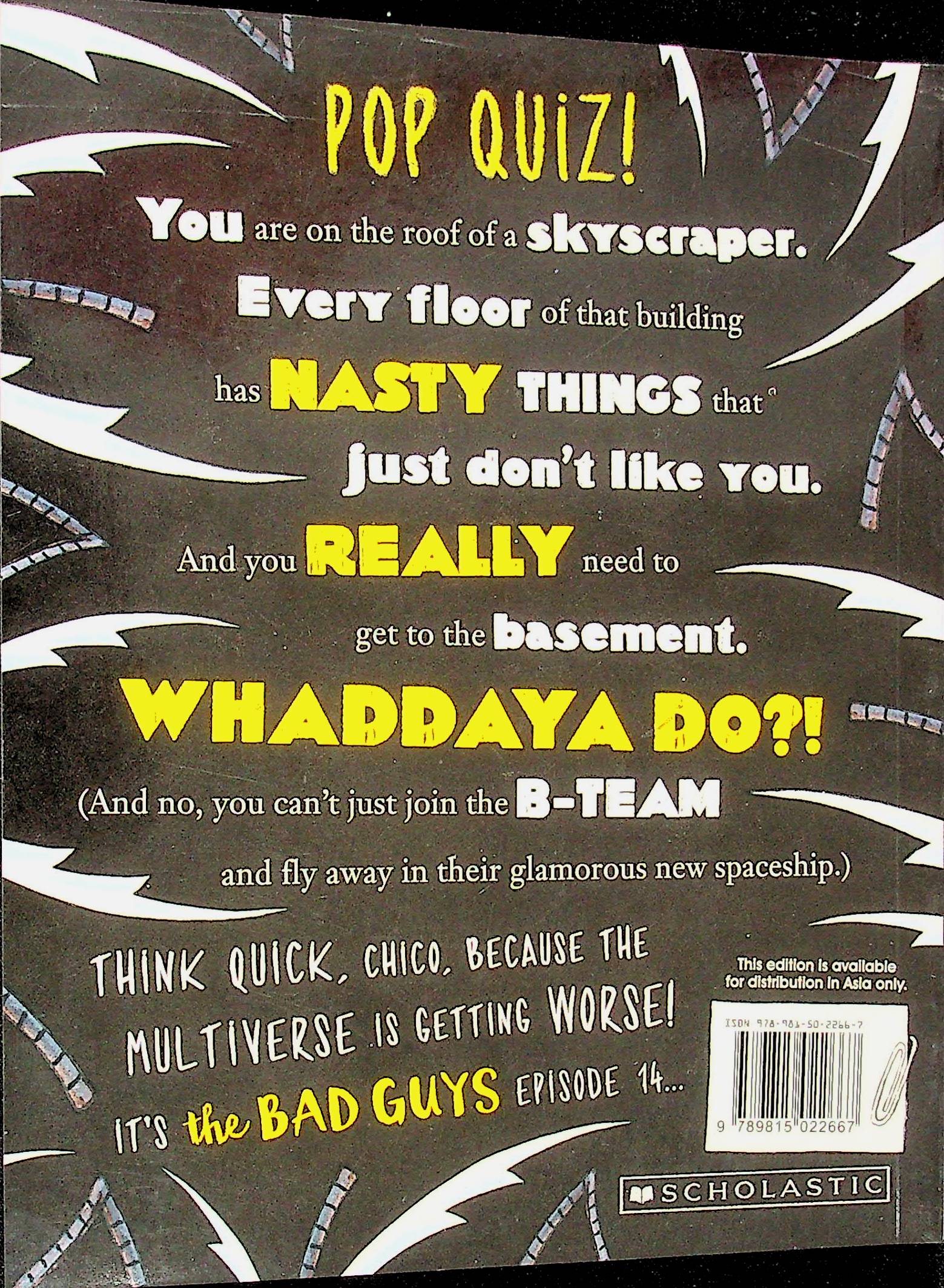 Mua tại TiktokThey may look like Bad Guys, but these wannabe heroes are doing good whether you like it or not in this New York Times bestselling illustrated series. POP QUIZ! You are on the roof of a skyscraper. Every floor of that building has nasty things that just don't like you. And you REALLY need to get to the basement. Whaddaya do?! (And no, you can’t just join the B-Team and fly away in their glamorous new spaceship.) Think quick, chico, because the multiverse is getting worse!