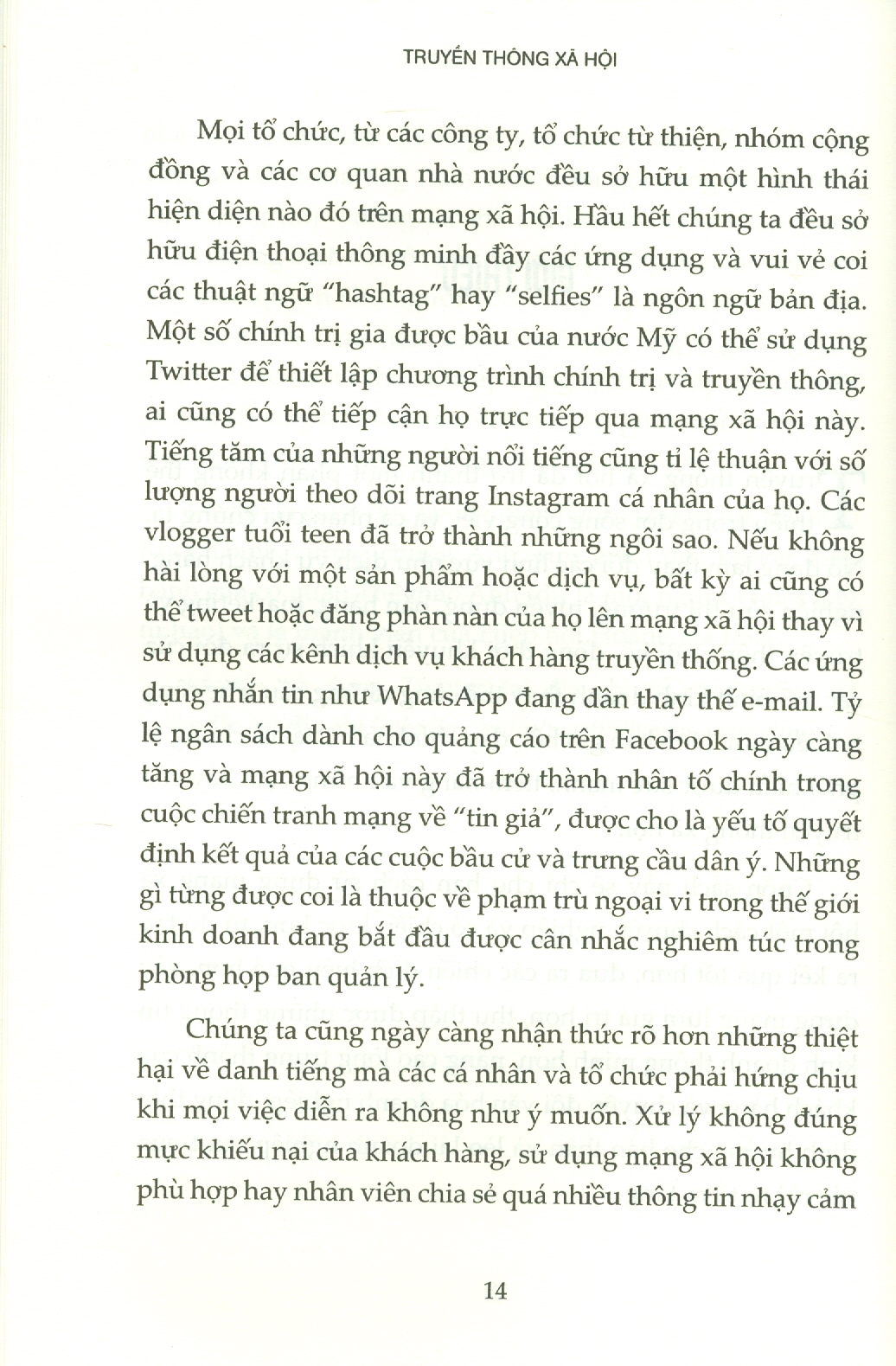 Truyền thông xã hội đang làm thay đổi các lĩnh vực như dịch vụ khách hàng, nghiên cứu thị trường, tuyển dụng, bán hàng, marketing và truyền thông nội bộ, đồng thời khuyến khích sự ra đời của các mô hình kinh doanh thay thế cùng những cấu trúc công ty kiểu mới. Hơn bao giờ hết, đây chính là lúc tất cả chúng ta phải hiểu được sức mạnh, tiềm năng và những cạm bẫy của truyền thông xã hội. Cuốn sách này sẽ chỉ cho bạn cách sử dụng mạng xã hội một cách chuyên nghiệp và có chiến lược hơn, từ đó tạo ra kết quả tốt hơn, đưa ra các chiến dịch hiệu quả hơn, xây dựng mạng lưới giá trị hơn, thu thập được những thông tin kinh doanh thông minh hơn, nâng cao lòng trung thành của khách hàng và chuyển đổi văn hóa doanh nghiệp, đồng thời định hướng cho bản thân và lèo lái doanh nghiệp vượt qua các rủi ro tiềm tàng.