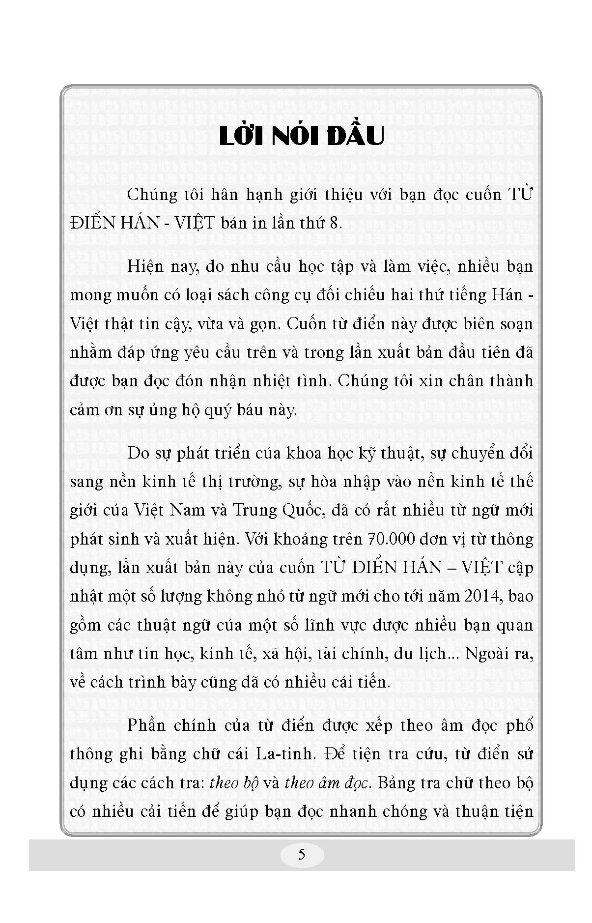 Chúng tôi hân hạnh giới thiệu với bạn đọc cuốn TỪ ĐIỂN HÁN - VIỆT bản in lần 8. Hiện nay, do nhu cầu học tập và làm việc,