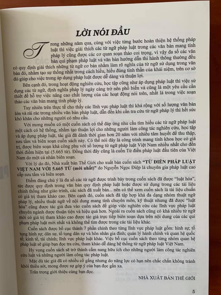 Với lý do đó, Nhà xuất bản Thế Giới cho xuất bản cuốn sách “TỪ ĐIỂN PHÁP LUẬT VIỆT NAM VỚI 5.665 TỪ (mới nhất)” do Nguyễn Ngọc Điệp là chuyên gia pháp luật cao cấp sưu tầm và biên soạn.