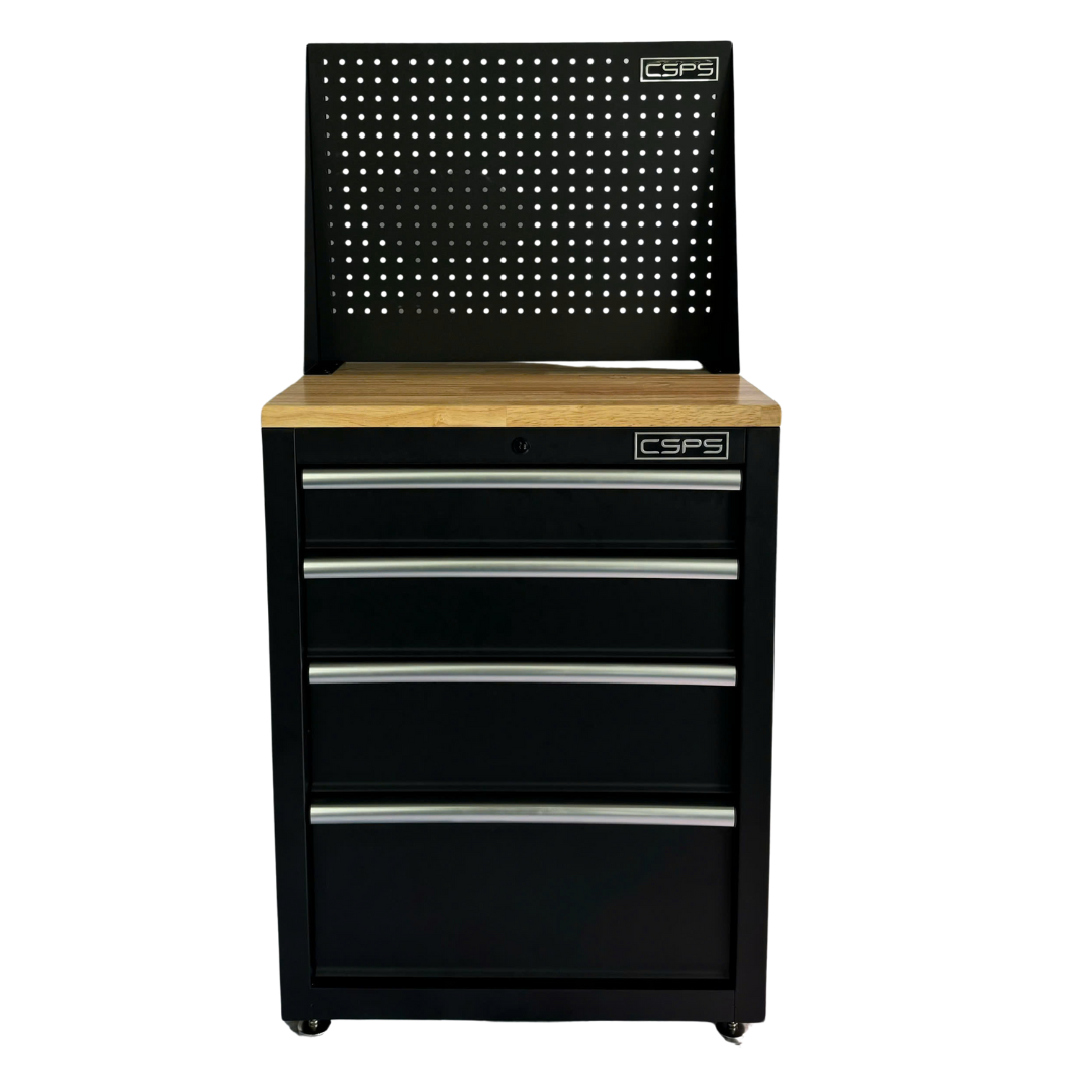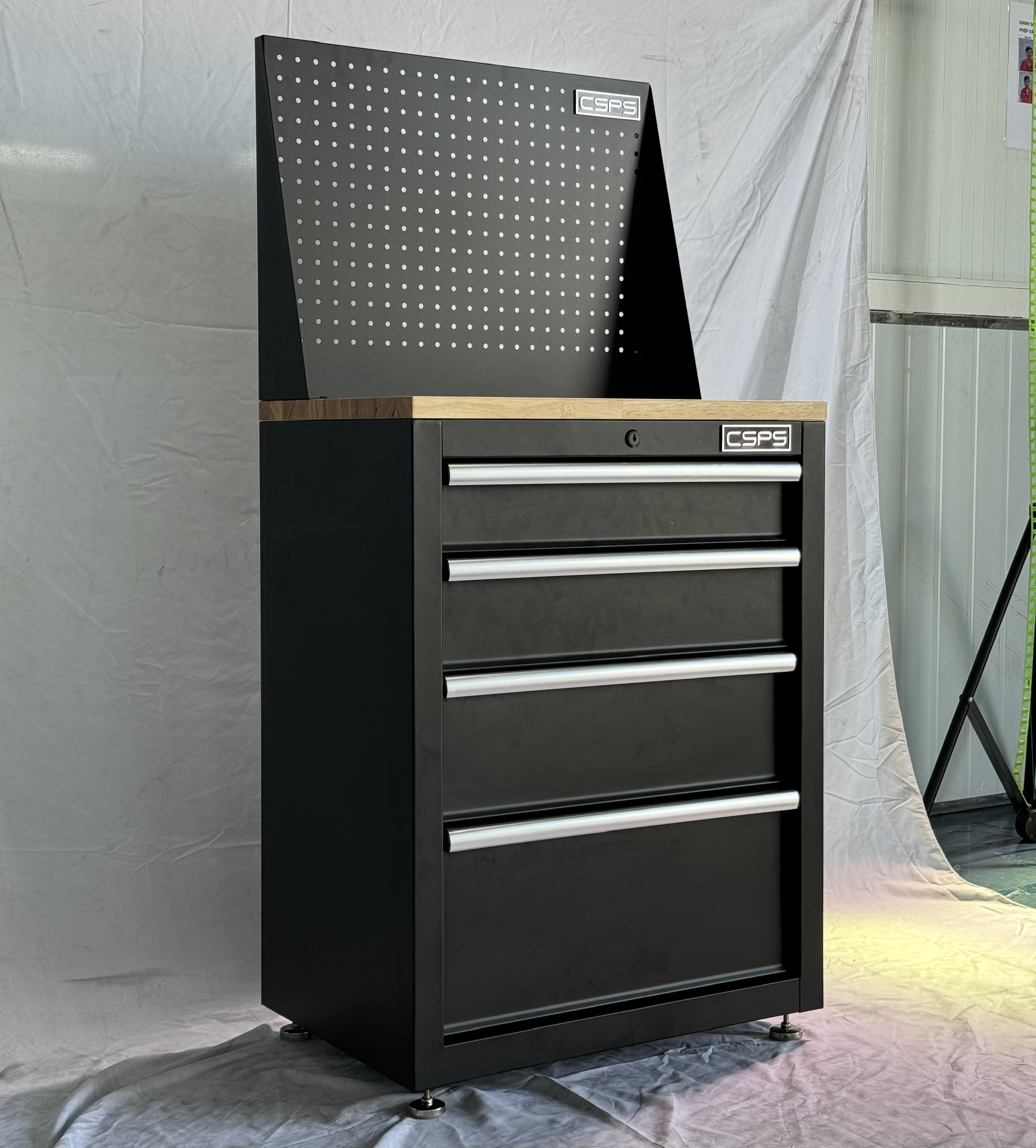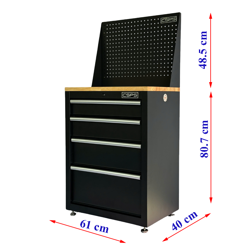 • Tủ dụng cụ CSPS 61cm - 04 hộc kéo màu đen chân tăng chỉnh ván gỗ vách lưới (tay cầm trắng)
