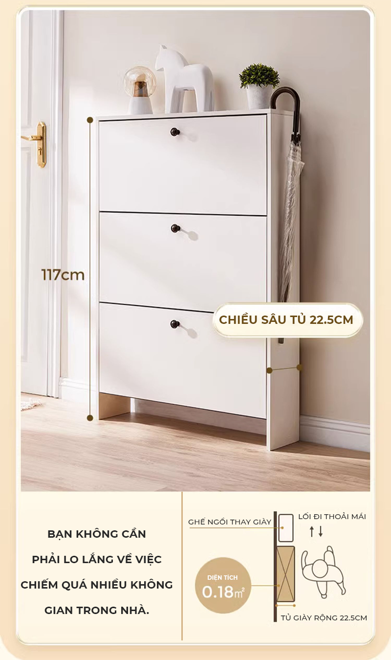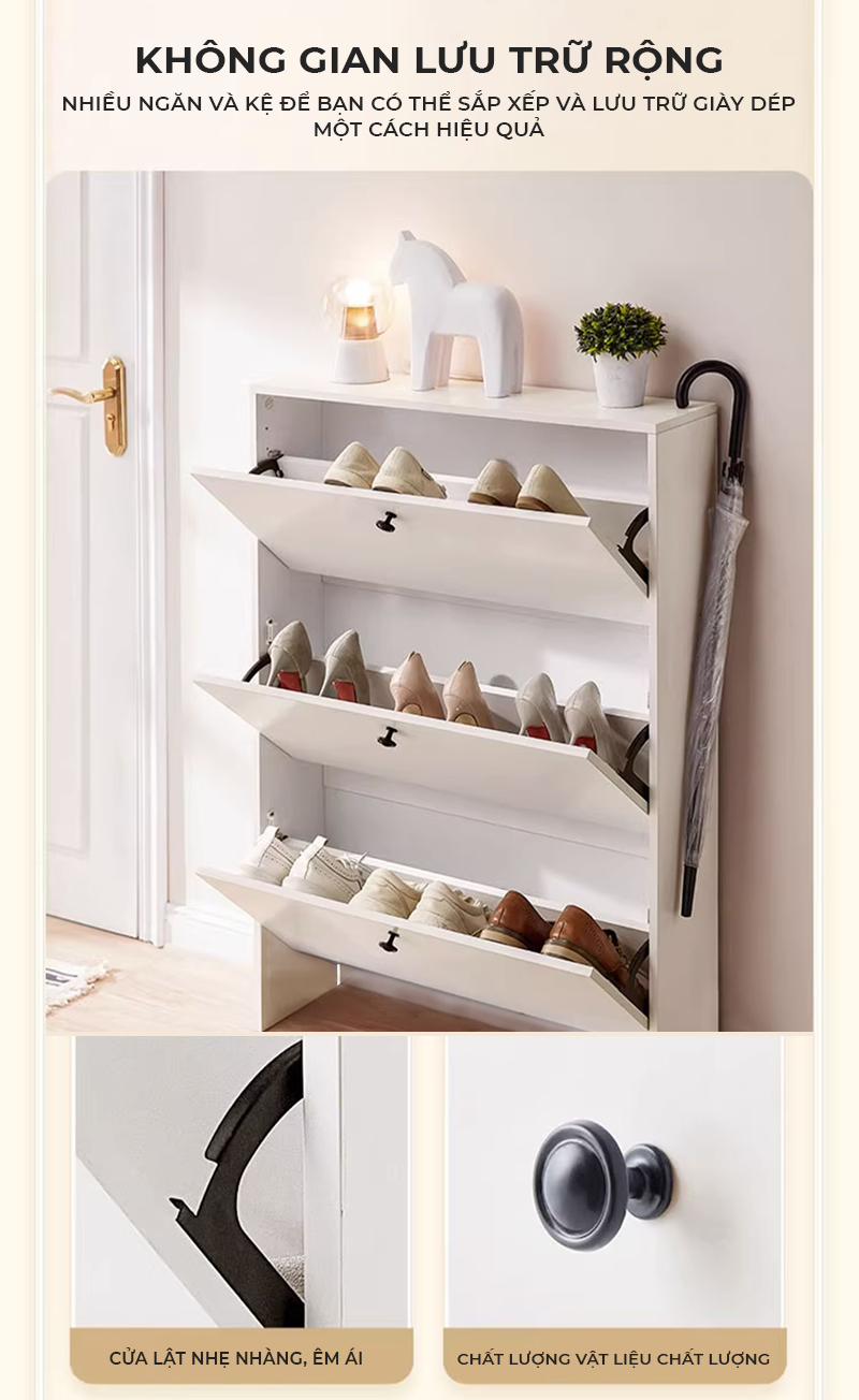 Công năng: Là mẫu tủ giày thông minh thiết kế 3 cánh lật lưu trữ 24 đôi giày dép, giúp bạn sắp xếp dày dép gọn gàng và ngăn nắp