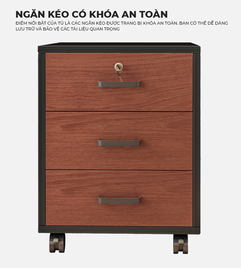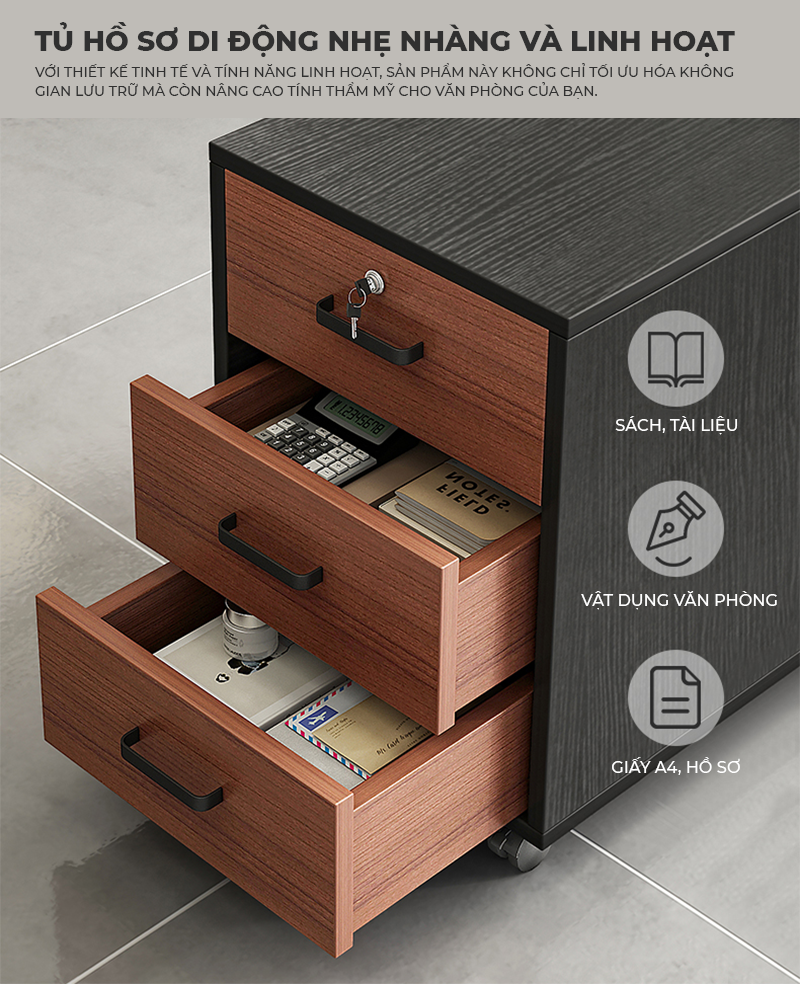 Tủ tài liệu 3 ngăn kéo, có bánh xe.