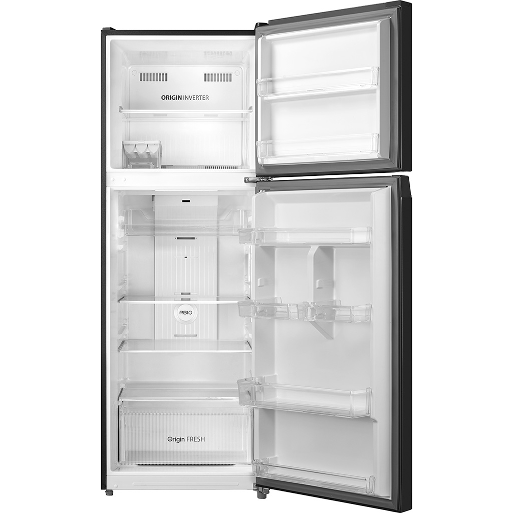 Tổng quan thiết kế - Tủ lạnh Hitachi với thiết kế kiểu dáng ngăn đá trên, tone màu đen dễ dàng kết hợp với nội thất trong nhà. - Cửa tủ lạnh được làm bằng chất liệu thép không
