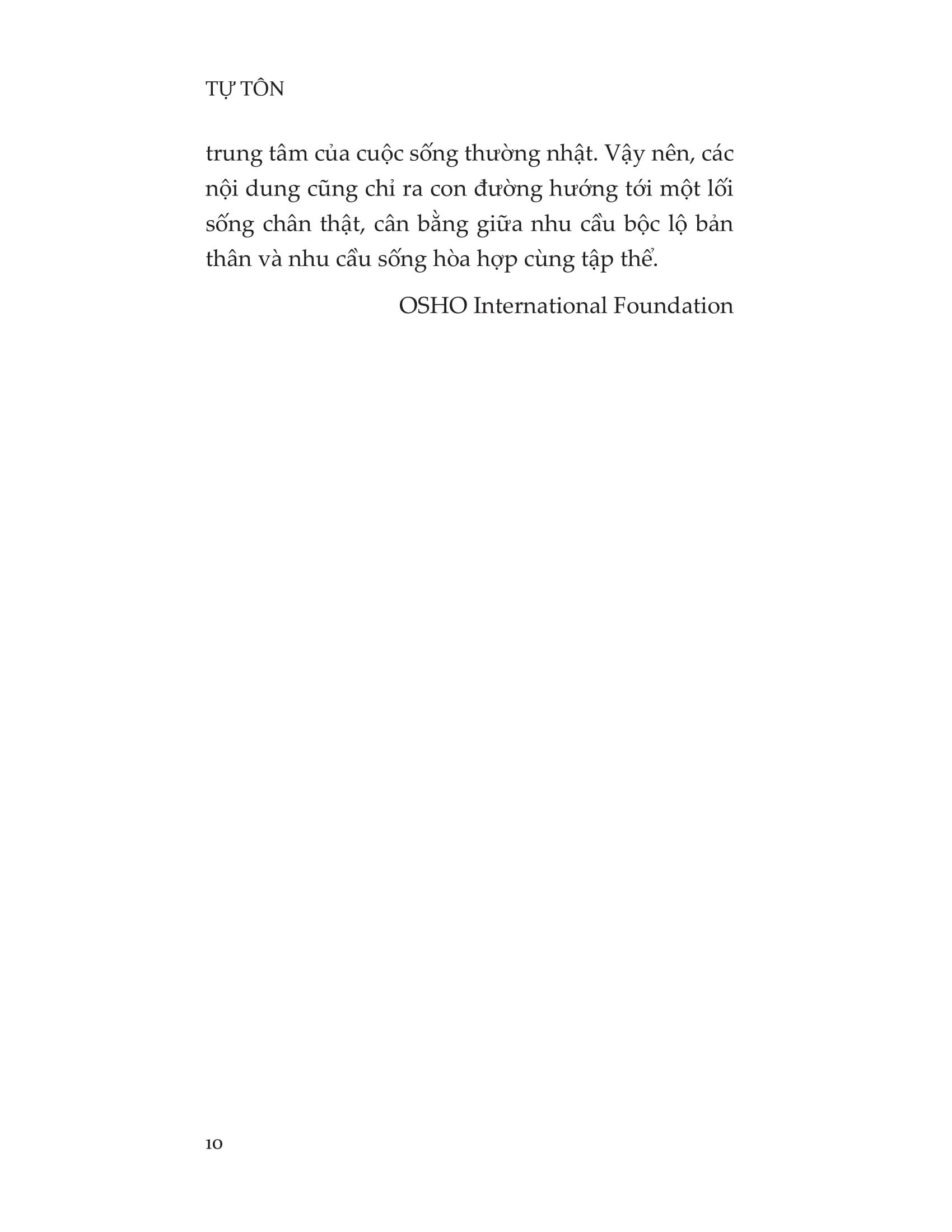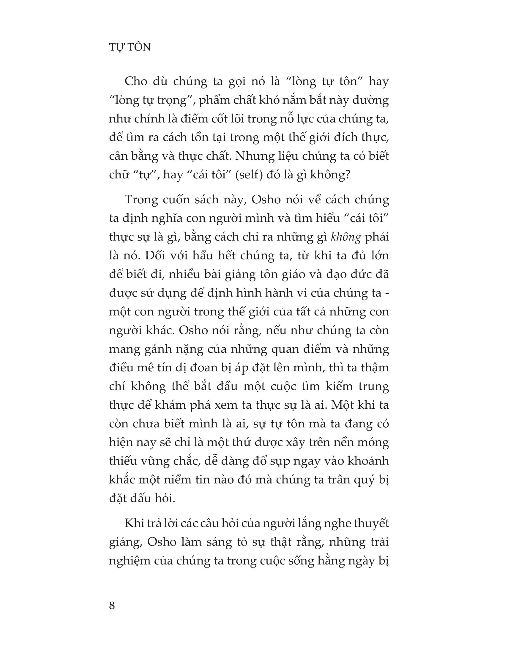 Trong Tự tôn, Osho giới thiệu đến độc giả ba yếu tố trụ cột: sự quan sát, sự nhận thức và sự tỉnh táo. Đây là chìa khóa để khám phá lại bản chất độc nhất của chúng ta, “cái tôi” chân thực nằm trong tất cả chúng ta. Và một khi ta tiến bước trên hành trình khám phá, thì mọi lẽ sai lầm mà chúng ta vẫn luôn mang theo người từ trước đến nay sẽ đơn giản là biến mất.