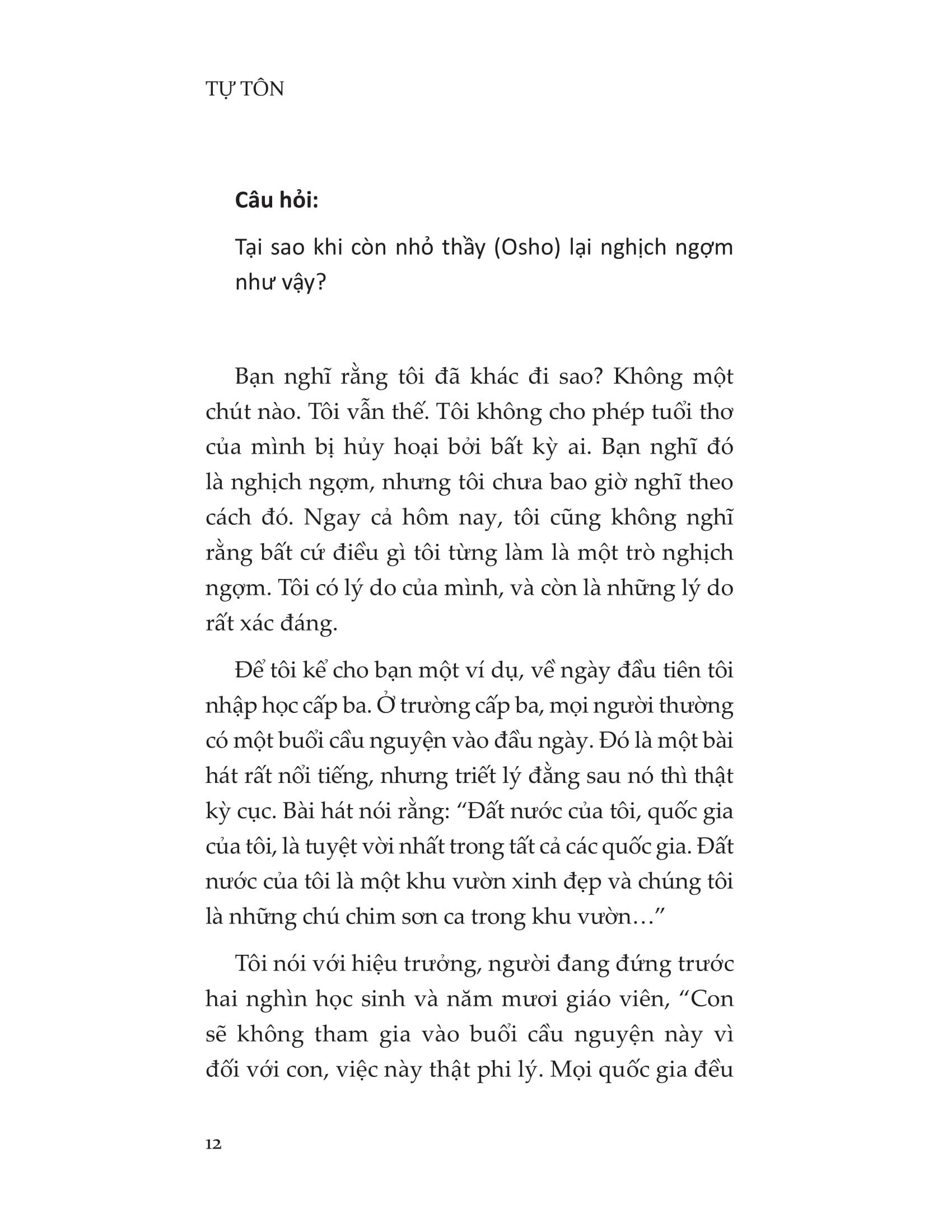 Trong cuốn sách này, Osho giúp chúng ta định nghĩa lại con người mình. Đối với hầu hết mọi người, từ khi ta đủ lớn để biết đi, nhiều bài giảng tôn giáo và đạo đức đã được sử dụng để định hình hành vi của chúng ta - một con người nhỏ bé trong thế giới của rất nhiều con người khác. Osho nói rằng, nếu như chúng ta còn mang gánh nặng của những quan điểm và những điều mê tín dị đoan bị áp đặt lên bản thân này, thì ta thậm chí không thể bắt đầu một cuộc tìm kiếm trung thực để khám phá xem ta thực sự là ai. Một khi ta còn chưa biết mình là ai, sự tự tôn mà ta đang có hiện nay sẽ chỉ là một thứ được xây trên nền móng thiếu vững chắc, dễ dàng đổ sụp ngay vào khoảnh khắc một niềm tin nào đó mà chúng ta trân quý bị đặt dấu hỏi.