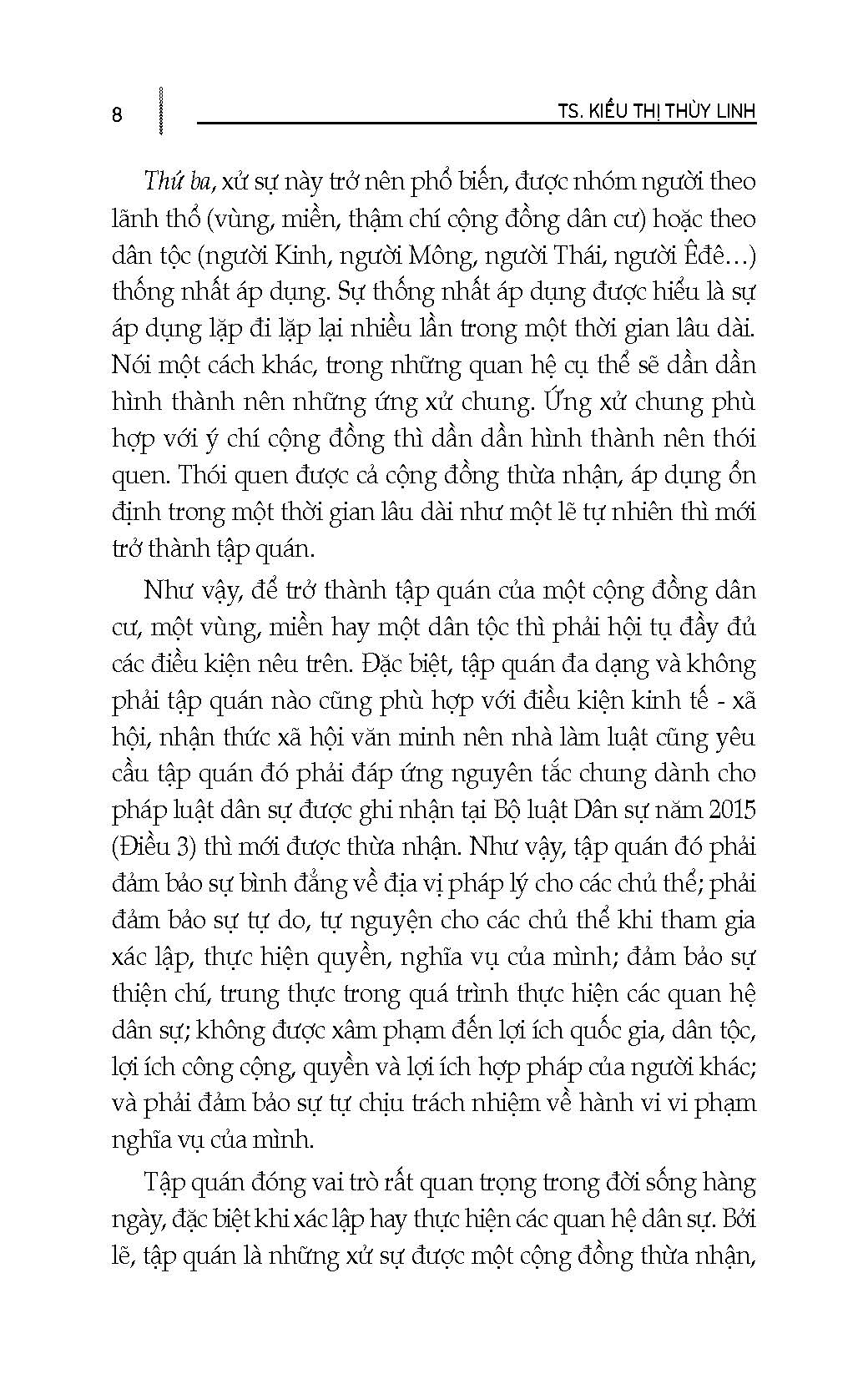 Cuốn sách trọng tâm giới thiệu về tập quán được pháp luật thừa nhận với tư cách là một nguồn quan trọng trong giải quyết các tranh chấp phát sinh. Thông qua các tình huống, câu hỏi, tác giả muốn giới thiệu những khía cạnh lý luận, làm rõ các điều kiện pháp luật đặt ra để áp dụng tập quán cũng như cho thấy vai trò tập quán trong quá trình giải quyết các tranh chấp của đời sống con người, đặc biệt những tranh chấp dân sự phát sinh trong đời sống hàng ngày. Đồng thời, tác giả cũng đưa ra các khía cạnh để đối sánh giữa tập quán với phong tục, luật tục, thói quen ứng xử.