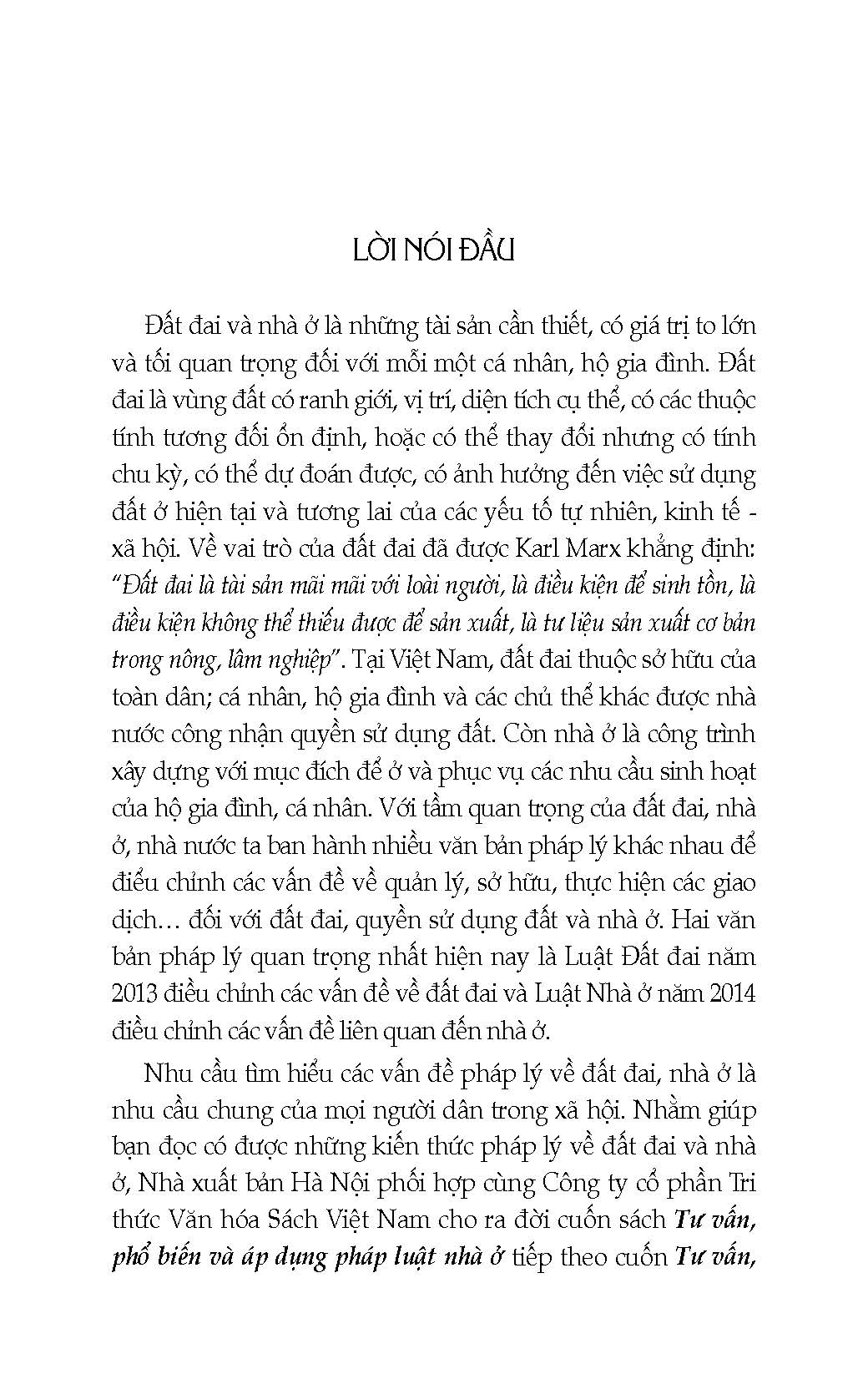 Cuốn sách này cung cấp cho bạn đọc nhiều kiến thức pháp lý hữu ích về đất đai và nhà ở. Chúng tôi hy vọng từ đó bạn đọc có thể vận dụng được những quy định pháp luật về đất đai và nhà ở vào các hoạt động của thực tiễn cuộc sống cũng như để giải quyết các tranh chấp phát sinh.